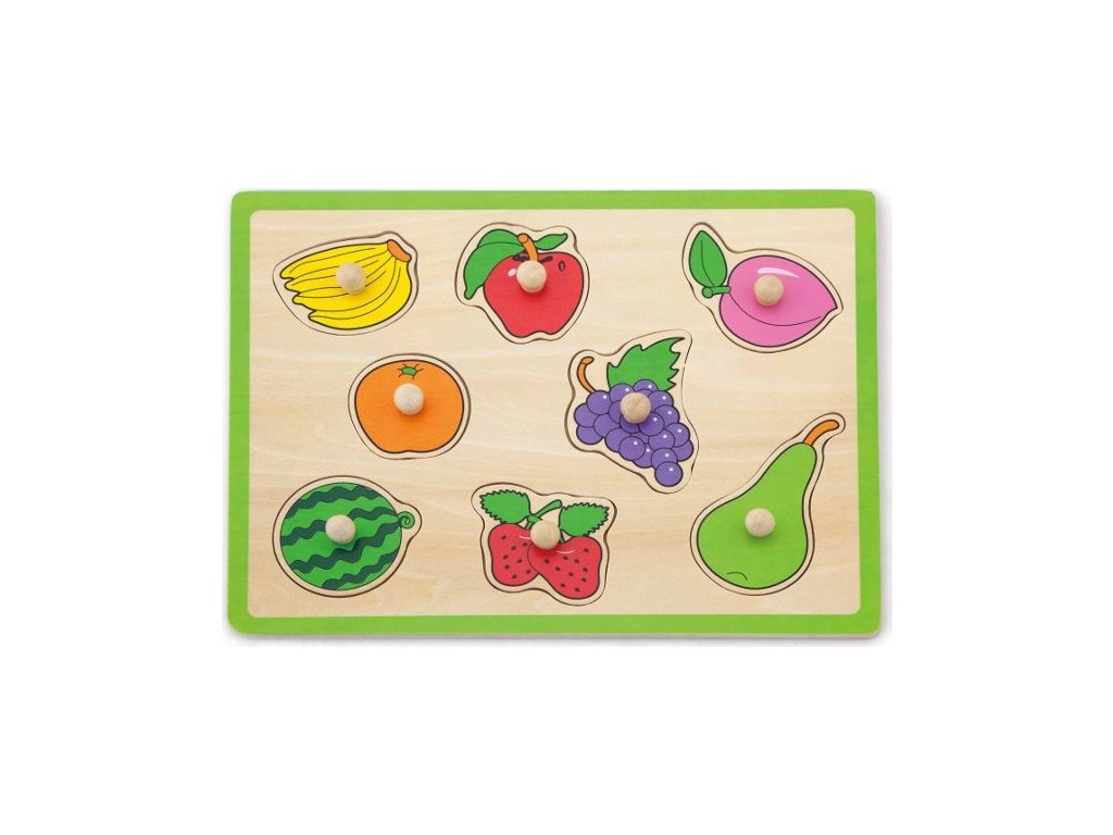 Dětské dřevěné puzzle s úchyty Viga Ovoce. Puzzle na dřevěném podkladu je tvořeno dílky s obrázky. Dětem se díky úchytům puzzle lépe drží v prstech a snáze se vkládá do určených míst. Balení obsahuje 8 dílků. Určeno pro děti od 18 měsíců. První puzzle pro Vaše malé děti, má velmi výrazné barvy, jednoduchý design a velké dílky. Naší prioritou je bezpečnost a kvalita našich výrobků, a proto barvy použité na hračkách nejsou toxické a splňují bezpečnostní standardy (EN71 a ASTM). Rozměr cca: 30x23 cm.