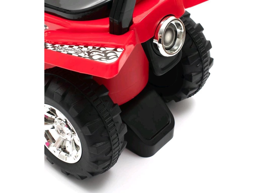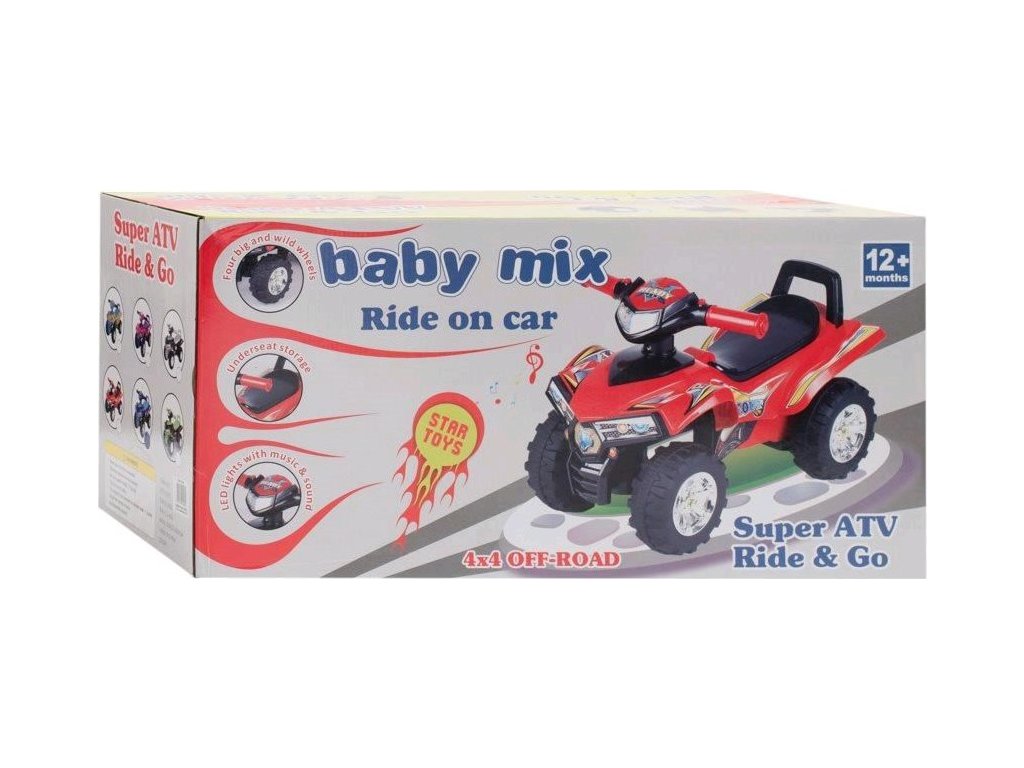 Skvělá Čtyřkolka Baby Mix se třemi melodiemi, klaksonem a blikajícími světýlky na řídítkách. Čtyřkolka má veselé barvy a je vyrobena z kvalitního a pevného plastového materiálu. Odrážedlo pomáhá rozvíjet motorické schopnosti dítěte a zaručí mu spoustu zábavy a legrace. Je určeno jak pro nejmenší děti, které už umí sedět, tak i pro děti, které se už naučily chodit. S čtyřkolkou si Vaše dítě užije spoustu legrace a zábavy. Naše super čtyřkolka skvěle vypadá, má komfortní široké sedadlo, široká řídítka a velká plastová kola. Na řídítkách má efektní houkačku a tlačítko se třemi uloženými melodiemi. Baterie nejsou součástí balení (2x AA 1.5V). Barvy samolepek se mohou lišit dle aktuální nabídky.