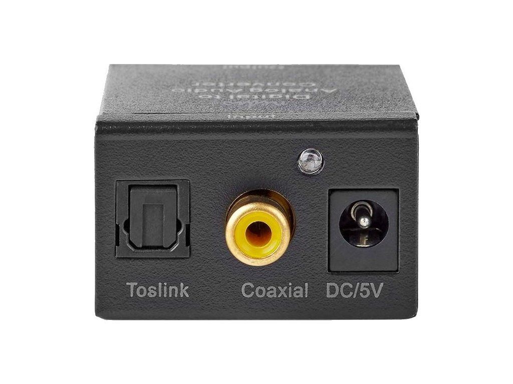 Nedis ACON2510BKTento digitálně-analogový audio (DAC) převodník s kovovým pouzdrem je vhodný pro převod digitálního zvukového signálu na analogový zvukový signál. Díky tomuto převodníku můžete připojit zařízení s optickým výstupem TosLink nebo koaxiálním výstupem RCA (S/P-DIF) k zesilovači/přijímači s analogovým stereofonním vstupem. Převodník je navíc vybaven sluchátkovým konektorem. O správné funkčnosti budete vědět díky indikační LED. Dodává se s napájecím adaptérem (5 V / 1 A).