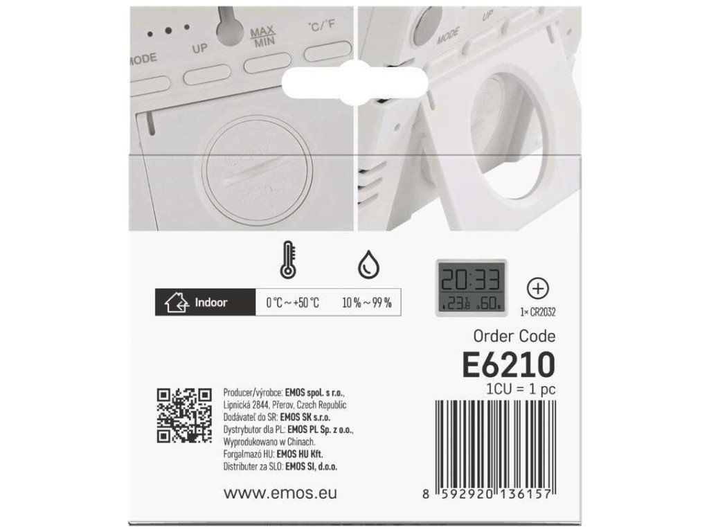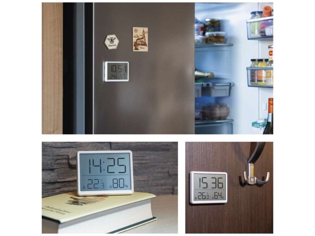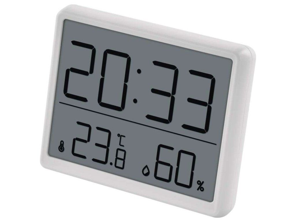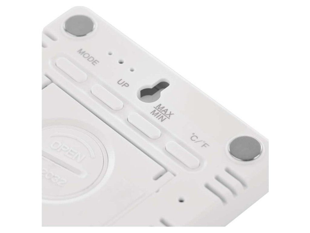 Teploměr v bílé barvě s hodinami řízenými Quarz krystalem. Zobrazuje vnitřní teplotu a vlhkost, hodiny, datum a má budík.