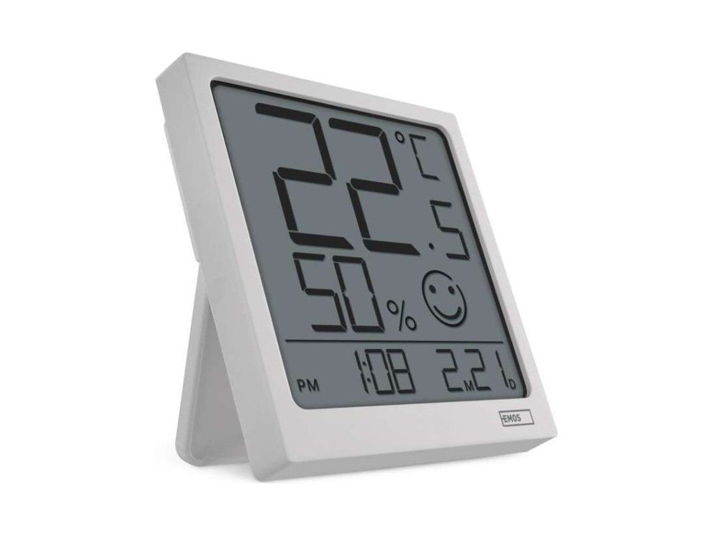 Teploměr v bílé barvě s hodinami řízenými Quarz krystalem. Zobrazuje vnitřní teplotu a vlhkost, hodiny, datum.