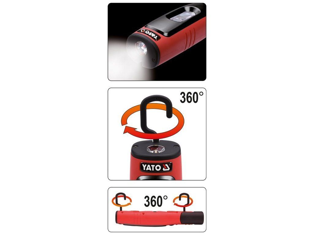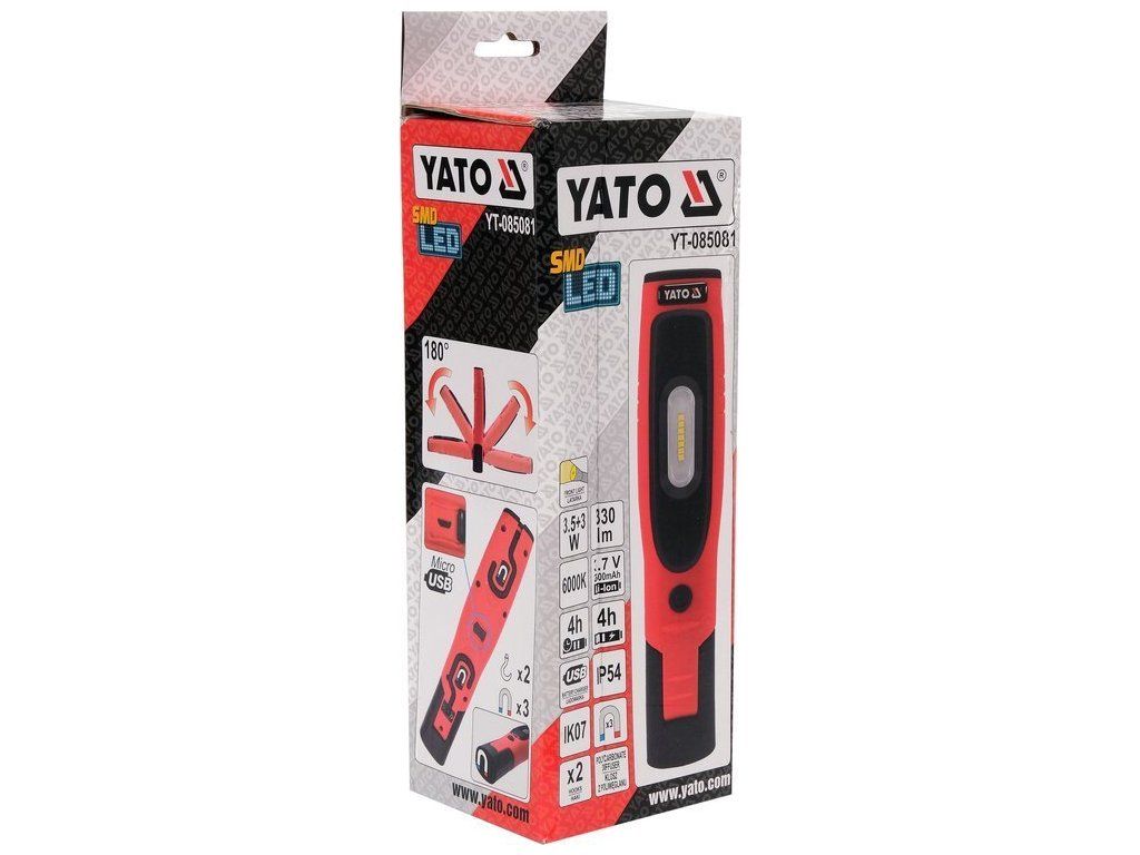 Nabíjecí dílenská lampa YATO s 330lm hlavním světlem a 80lm baterkou. Model je vybavený prostornou, lithium-iontovou baterií s kapacitou 2600mAh, která poskytne minimálně 4 hodiny nepřetržitého provozu. Vyrobeno z odolných materiálů vč. ABS a polykarbonát, které zajišťují třídu mechanické ochrany IK07 a třídu těsnosti IP54.