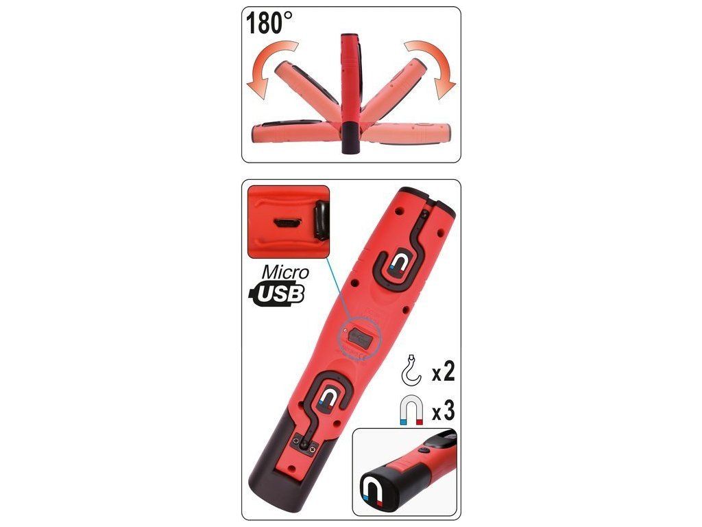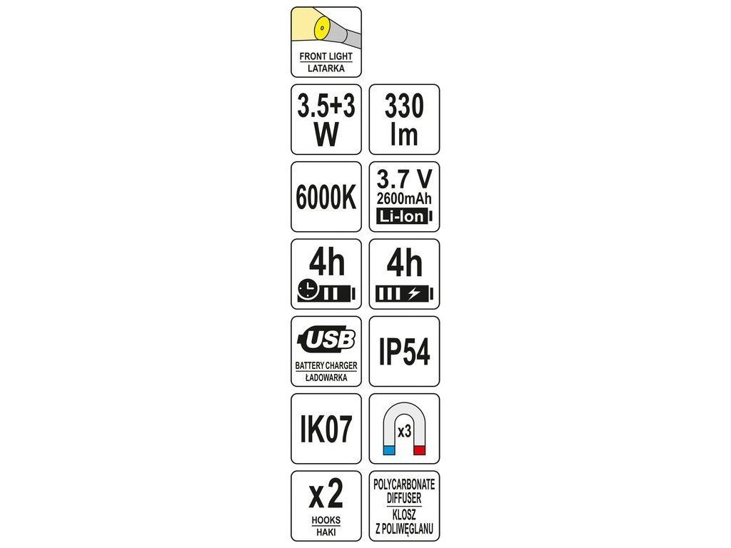 ZDROJ SVĚTLA: Dioda: 3,5W SMD LED + 3W POWER LED Lumeny: 330lm hlavní světlo, 80lm baterka Barva: 6000K ZDROJ ENERGIE: Baterie: LI-ION 3,7V 2600mAh Pracovní doba: 4h Doba nabíjení: 4h Nabíjení: 230V síťová nabíječka + USB kabel KONSTRUKCE A VLASTNOSTI: Materiál: ABS + guma Difuzor: polykarbonát (PC) Otočné tělo 2 háčky 2 magnety na zadní straně lampy a magnet v základně Třída těsnosti IP54 Třída mechanické ochrany IK07 Rozměry: 25 x 5,5 x 4 cmDoplňkové parametry