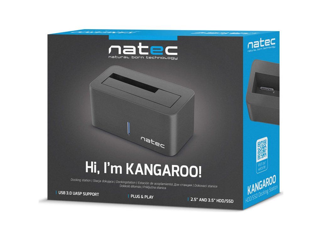 Dokovací stanice Kangaroo podporuje 2,5" a 3,5" HDD i SSD s rozhraním SATA I/II/III. Díky funkci Plug&Play, která je kompatibilní s většinou operačních systémů Windows a IOS si počítač automaticky nainstaluje potřebné ovladače.