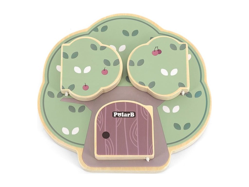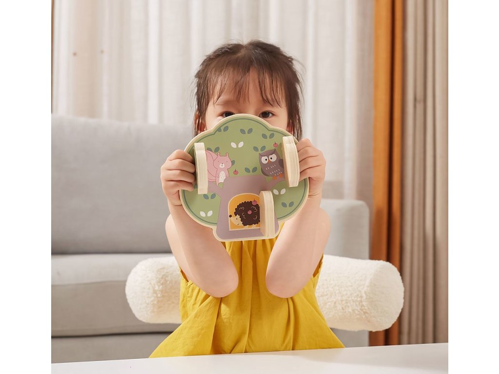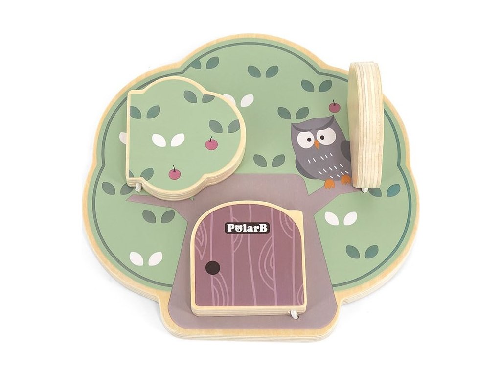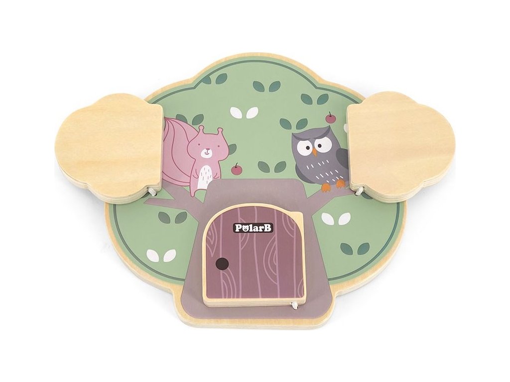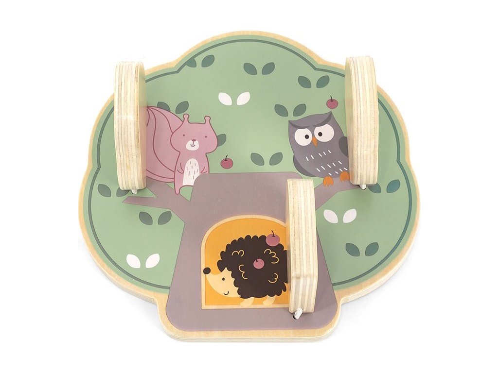 Představujeme dřevěnou manipulační desku ve tvaru stromu, která skvěle rozvíjí smyslové a logické myšlení dětí. Na dřevěné desce jsou 3 dvířka a za každými dvířky je jiné zvířátko: veverka, sova a ježek, který na zádech nosí jablka.
