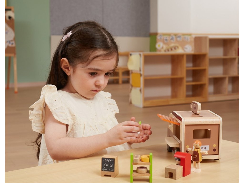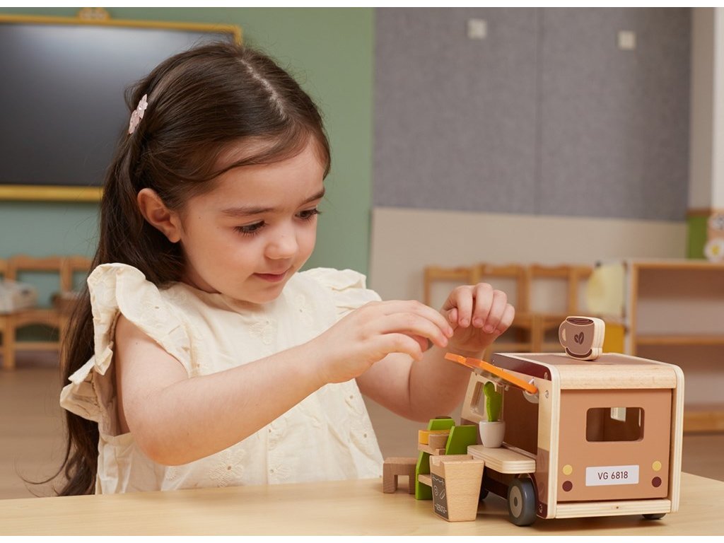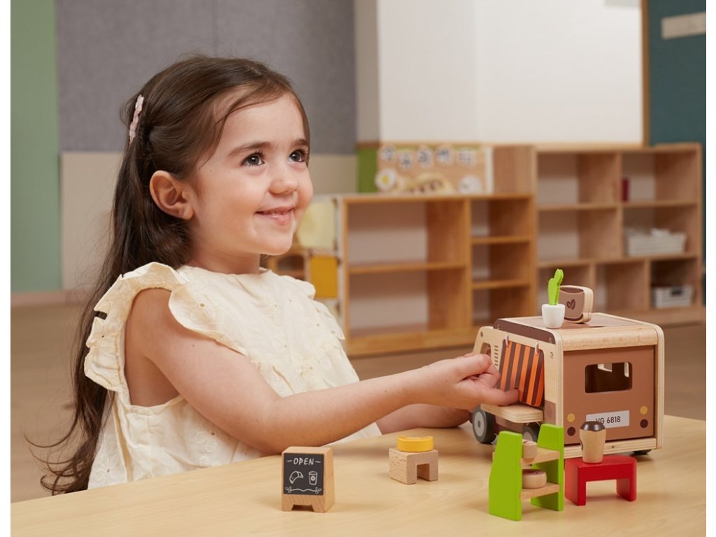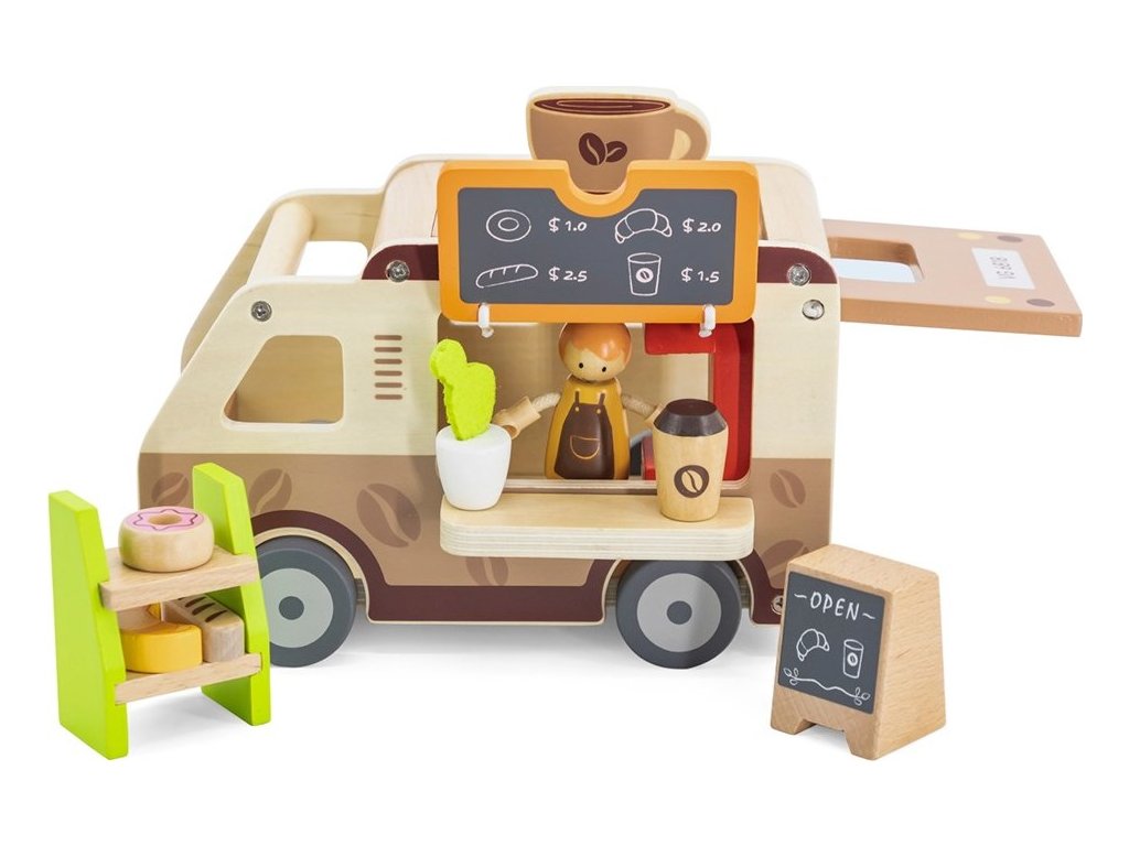 Pevná dřevěná konstrukce a jemné pastelové barvy nanesené netoxickými barvami činí hračku nejen esteticky příjemnou, ale i bezpečnou pro nejmenší. Sada je navržena s ohledem na rozvoj představivosti, manuálních dovedností a sociálních schopností dětí a nabízí mnoho hodin kreativní zábavy. Perfektní pro děti, které milují dobrodružství a sní o vlastní mobilní kavárně na kolech.