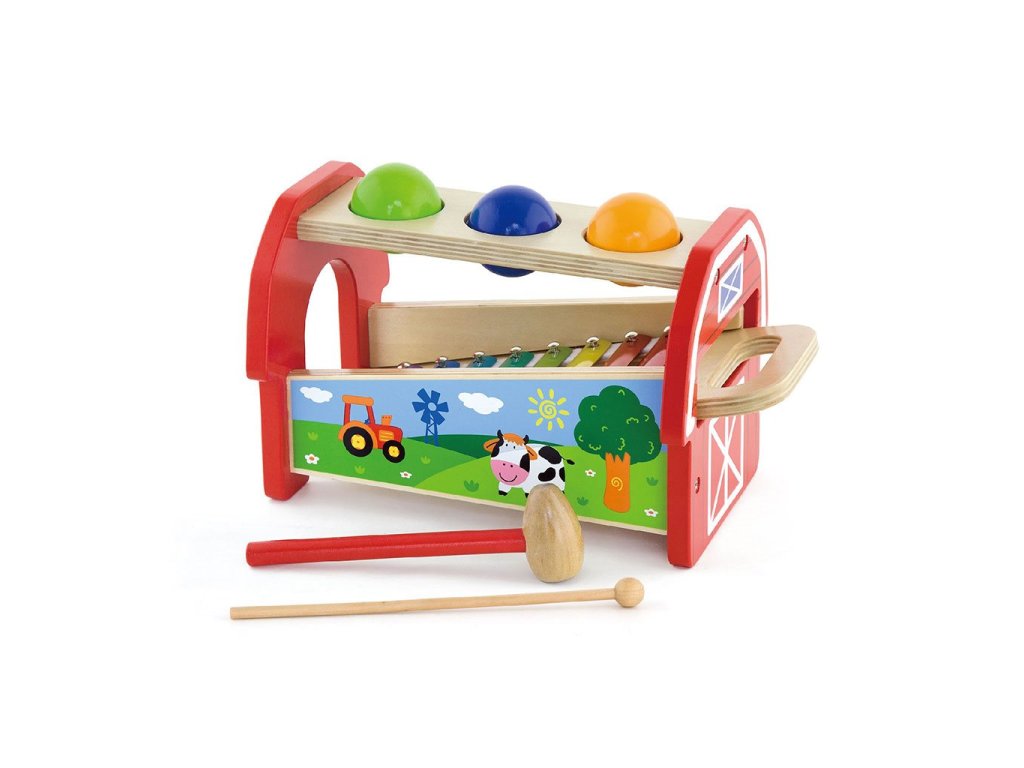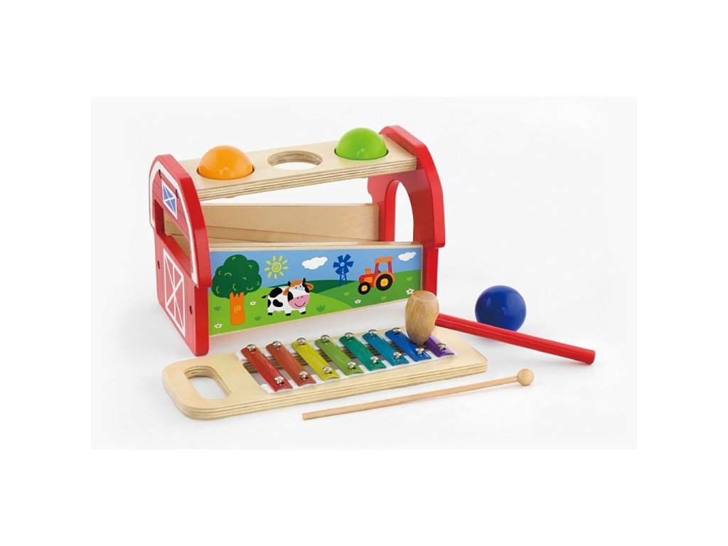 Zatloukačka s xylofonem od společnosti Viga je jednou z nejkrásnějších hraček, díky které dítě rozvíjí manuální dovednosti, představivost a logické myšlení. Hračka má dvě funkce, které dětem zajistí dvojnásobnou zábavu. Úkolem dítěte je prostrčit barevné kuličky otvory v horní části hračky. Když kuličky spadnou dovnitř, rozezní se jemná melodie.