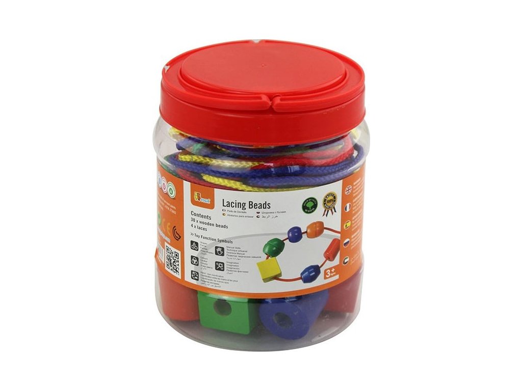 Balení obsahuje 30 kusů barevných korálků různých tvarů a 4 kusy navlékací šňůrky. Posouváním dřevěných korálků po šňůrce mohou děti vytvářet nekonečné vzory a kombinovat různé tvary a barvy.