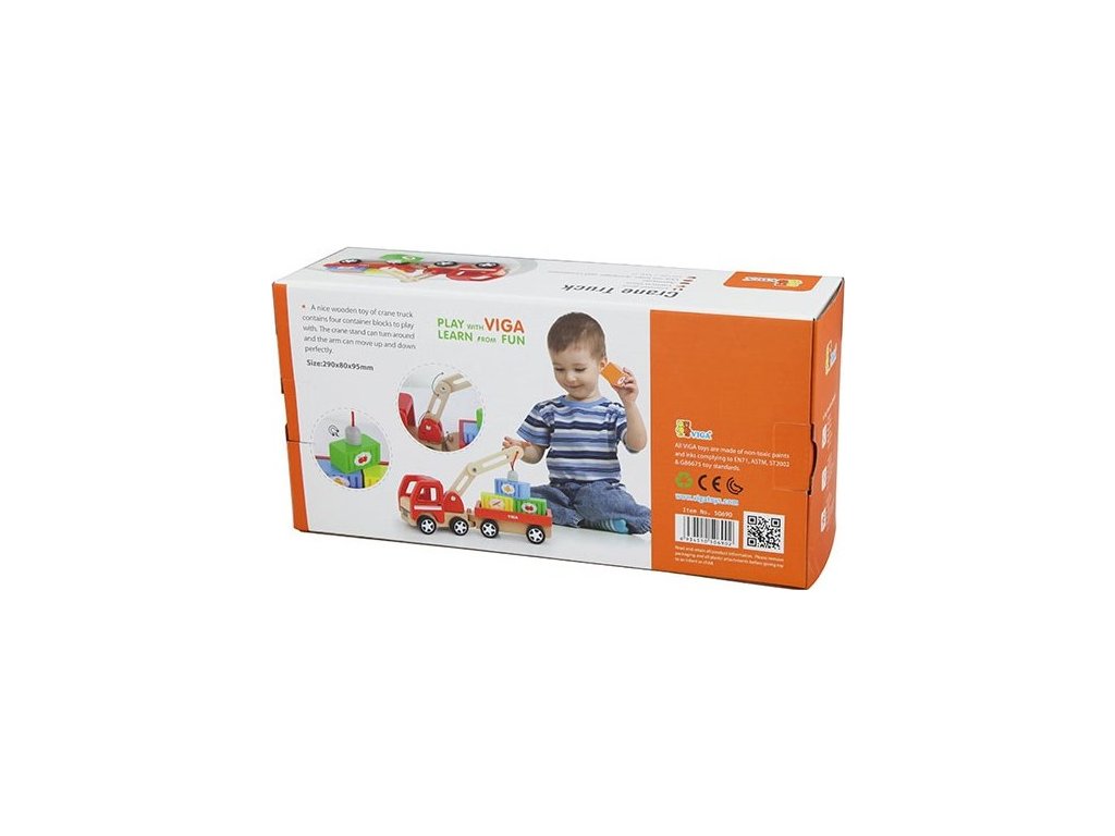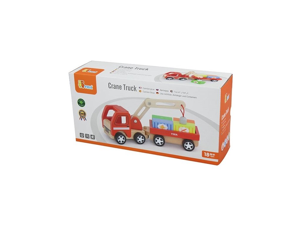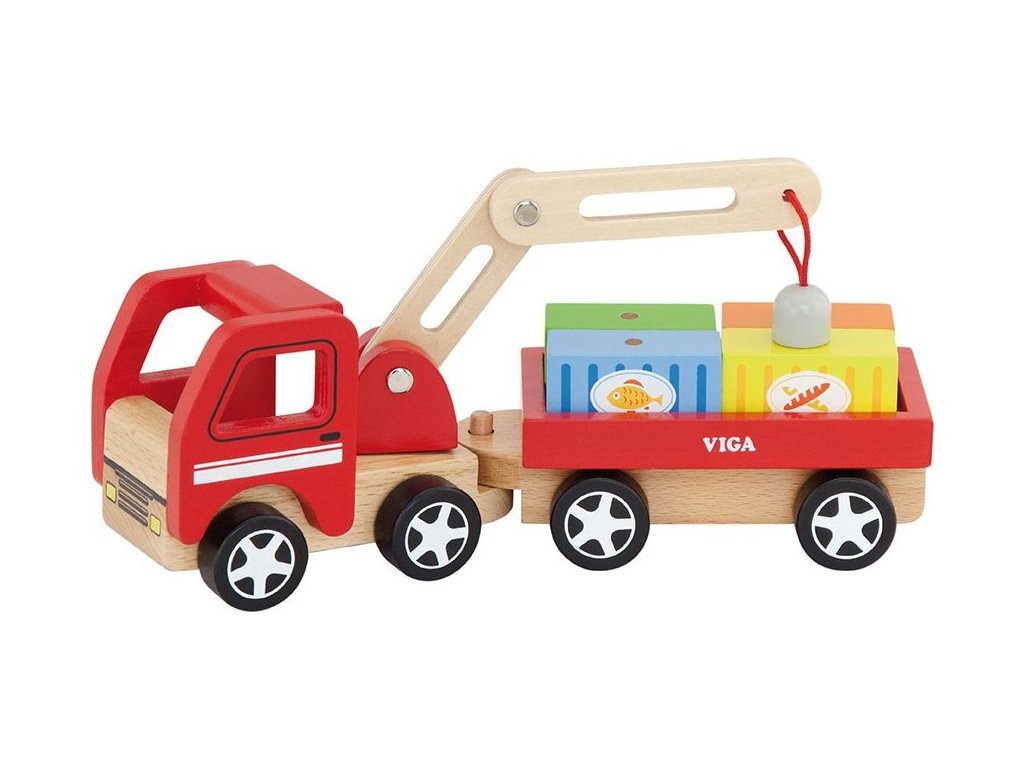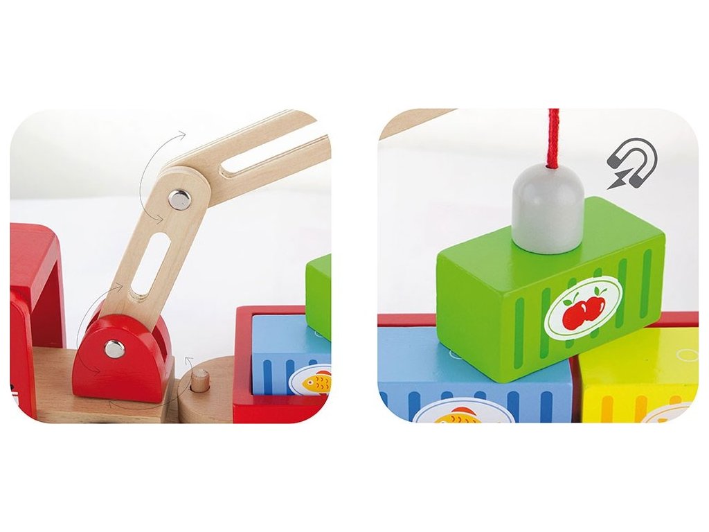 Sada se skládá z auta s otočným jeřábem a magnetem, odnímatelného přívěsu a čtyř tematických nádob (ovoce, chléb, zelenina, ryby) s magnety, které umožní vašemu batoleti nakládat a vykládat dopravní prostředky. Celá sada je vyrobena z bukového dřeva natřeného nezávadnými barvami .