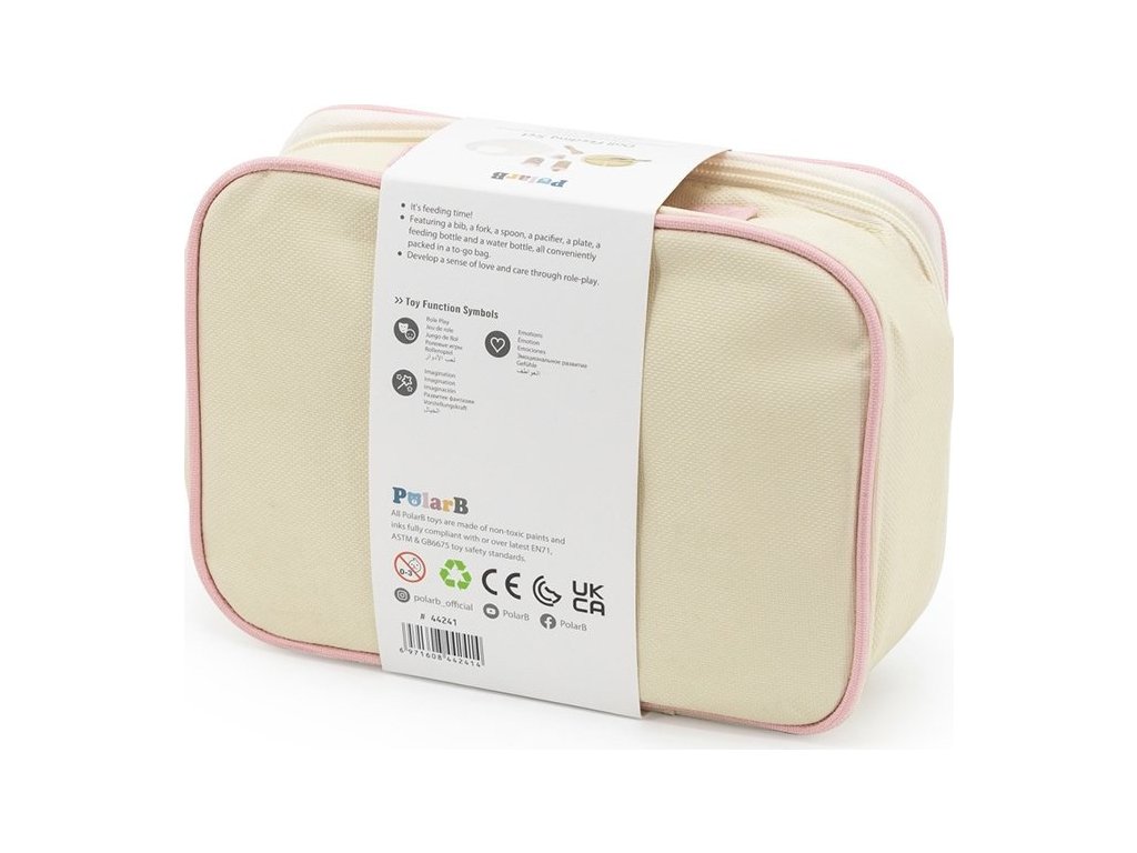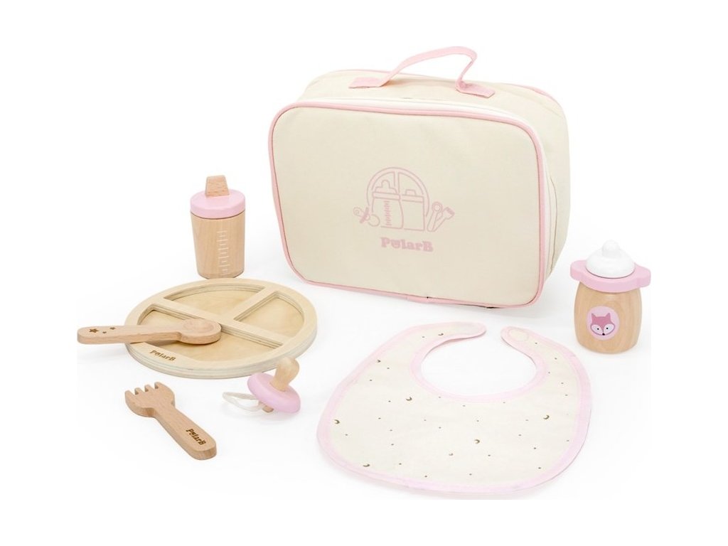 V sadě najdete: bryndáček, vidličku, lžičku, dudlík, talířek, láhev na krmení a láhev s vodou – vše přehledně zabaleno v látkovém organizéru.