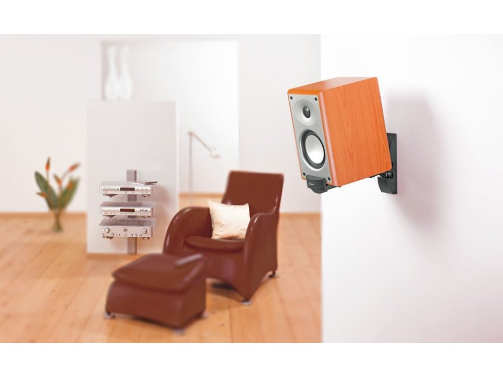 Nástěnný držák bez nutnosti vrtání do skříně reprosoustavy, ta se sevře čelisťovým mechanismem. Ideální pro regálové reprosoustavy střední velikosti.