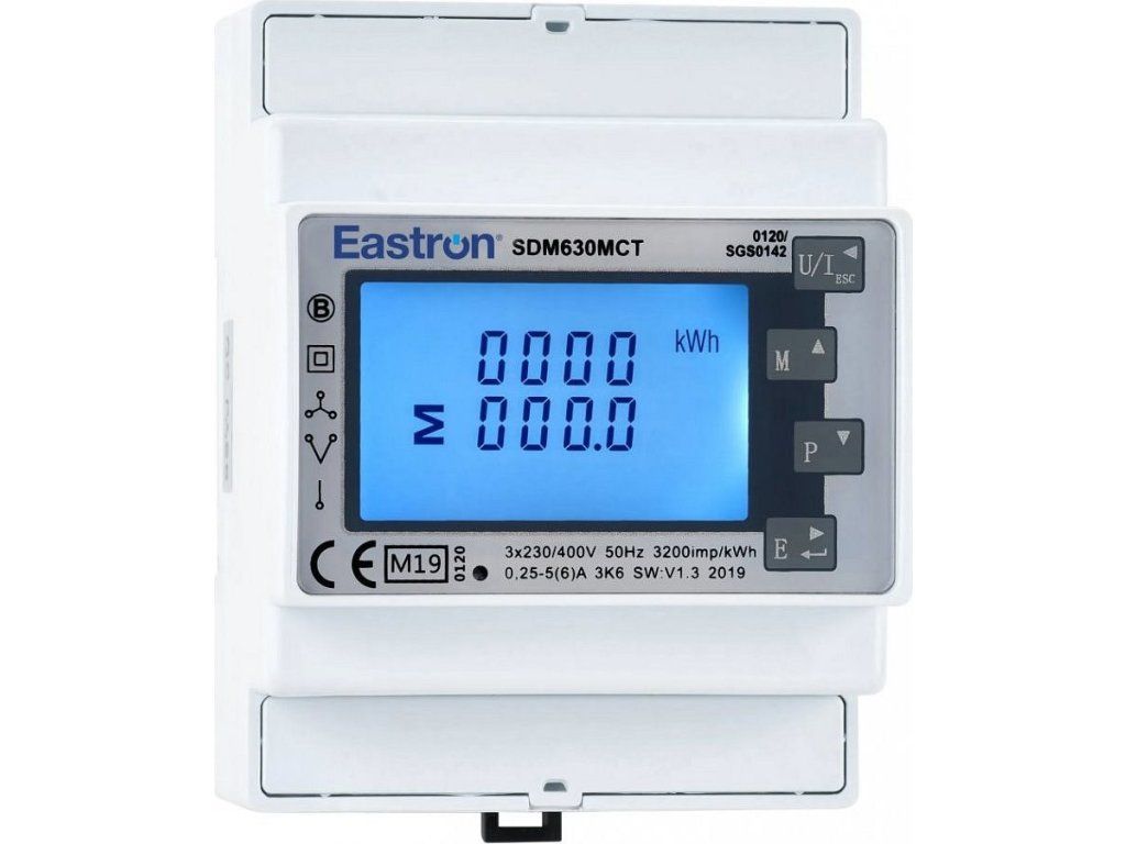 Eastron SDM630MCTInteligentní elektroměr pro 1fázové a 3fázové měření. Mezi měřené parametry patří napětí (V), frekvence (Hz), proud (A), výkon (kW/kVA/kVAr), import, export a celková energie (kWh/kVArh). Přístroj může měřit také maximální odběr proudu a výkonu.