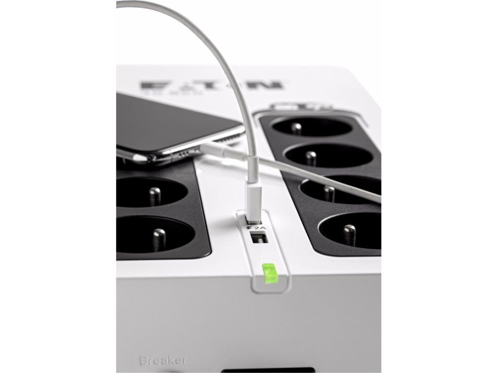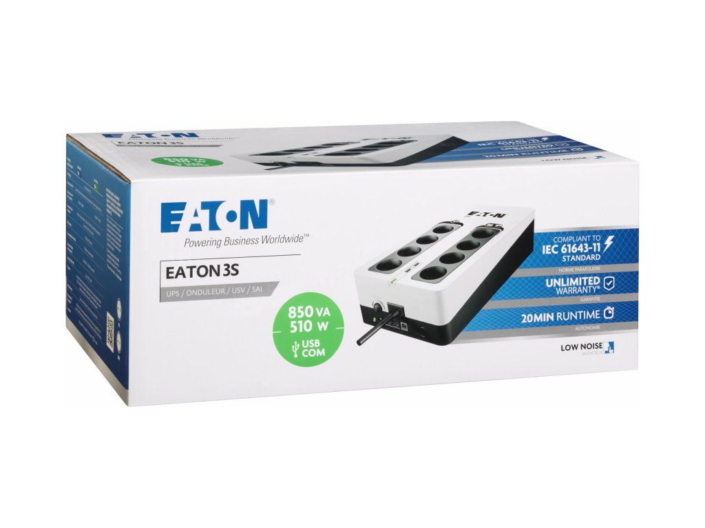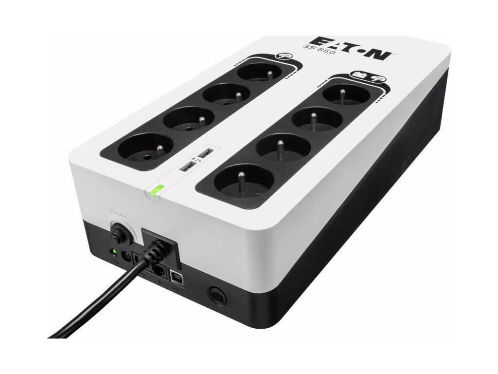 Eaton 3S850FUPS Eaton 3S pomáhá chránit vaši výpočetní techniku v případě výskytu nežádoucích jevů a událostí, jako jsou atmosférické výboje, bouřky, přetížení rozvodné sítě, poruchy a živelné události, způsobující bez předchozího varování výpadky napájení z elektrorozvodné sítě. Při úplném výpadku poskytuje UPS záložní napájení z baterie až čtyřem z osmi připojitelných zařízení. Tento záložní zdroj též chrání telefonní, širokopásmové a Ethernetové připojení proti přepětí. Software pro odstavení umožňuje automatické uložení rozpracovaných úloh a ukončení vašich aplikací bez ztráty dat díky propojení USB portem. Po obnovení napájení budete moci pokračovat přesně z bodu, ve kterém jste aplikaci ukončili. Díky atraktivnímu designu a líbivé povrchové úpravě UPS 3S dokonale zapadne do moderního kancelářského prostředí.