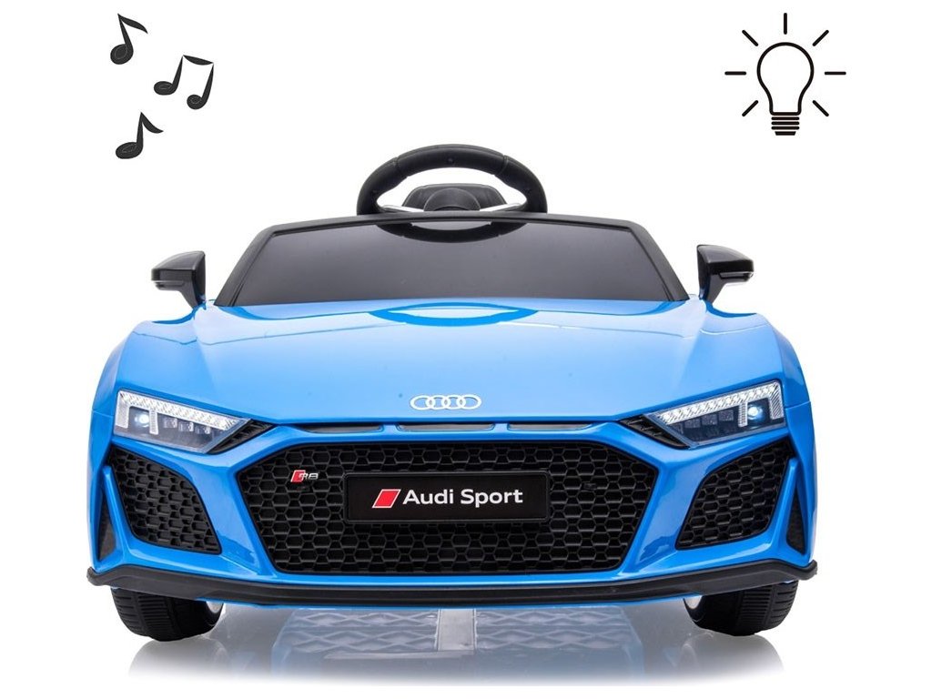 Po sešlápnutí plynového pedálu tohoto úžasného Audi R8 Spyder se vozidlo rozjede a zároveň se rozsvítí přední světlomety díky dvěma motorům. Velká, široká EVA kola s běhounem a sportovními ráfky zajistí mobilitu při výletech mimo domov, zatímco profilované sedadlo poskytne dítěti pohodlí a bezpečnost. Ocelové nápravy kol zajišťují stabilitu a odolnost vozidla. Zábava nekončí: hudební funkce na kokpitu, USB port, Bluetooth, přehrávání hudby, ovládání hlasitosti +/- , 4 písně po stisknutí tlačítka na volantu vlevo, zvuk klaksonu po stisknutí tlačítka na pravé straně volantu – to vše činí hru ještě zajímavější!