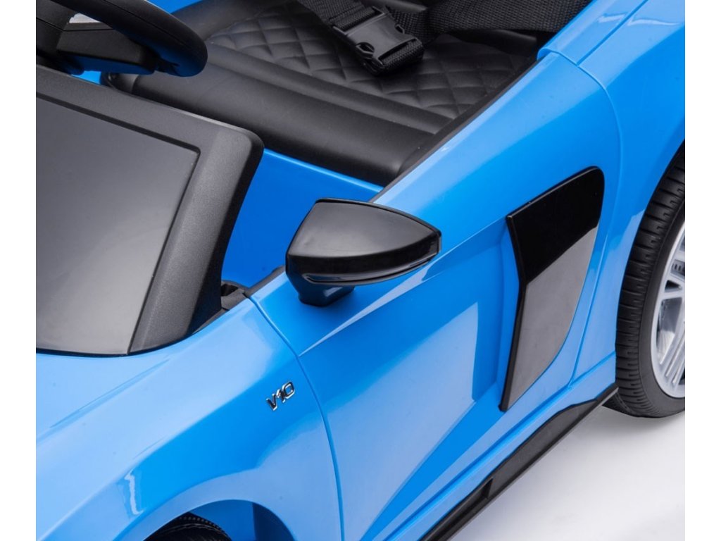 Autíčko na akumulátor, stejně jako jeho originál, je kombinací sportovního designu a klasického charakteru. Vozidlo je vyrobeno s důrazem na nejmenší detaily z vysoce kvalitních materiálů, které se vyznačují vysokou odolností a bezpečností. Ovládejte elegantní volant vozidla Audi R8 Spyder a cítíte se jako skutečný řidič sportovního auta. Stejně jako originální Audi R8 Spyder, i naše akumulátorové vozidlo díky horizontálním liniím vpředu vypadá širší a nižší, zatímco po stranách dominují panely Sideblades a mřížky výstupu vzduchu vzadu, což vytváří jedinečný charakter vozidla. Vozidlo vzbuzuje obdiv svou přítomností a možností jízdy s otevřenou střechou – kabriolet. Pohodlné velké profilované sedadlo R8 s bezpečnostním pásem je výhodou a komfortem pro dítě. Ovládání na dálkový ovladač, který má funkci blokování rychlosti - P, označení jednoho z 3 stupňů rychlosti – S, funkce zatáčení a jízdy vpřed a vzad.