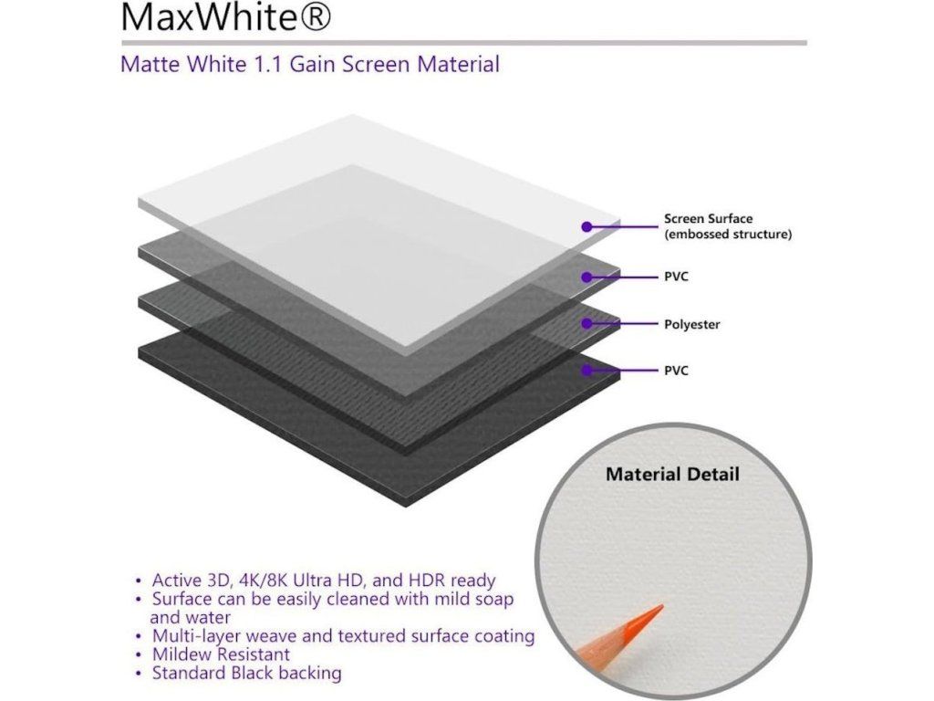 MaxWhite je nejuniverzálnější povrch plátna pro přední projekci prezentace. Tento materiál poskytuje široký pozorovací úhel, perfektní rovnoměrnost rozptylu, jasný obraz a skvělou reprodukci barev.