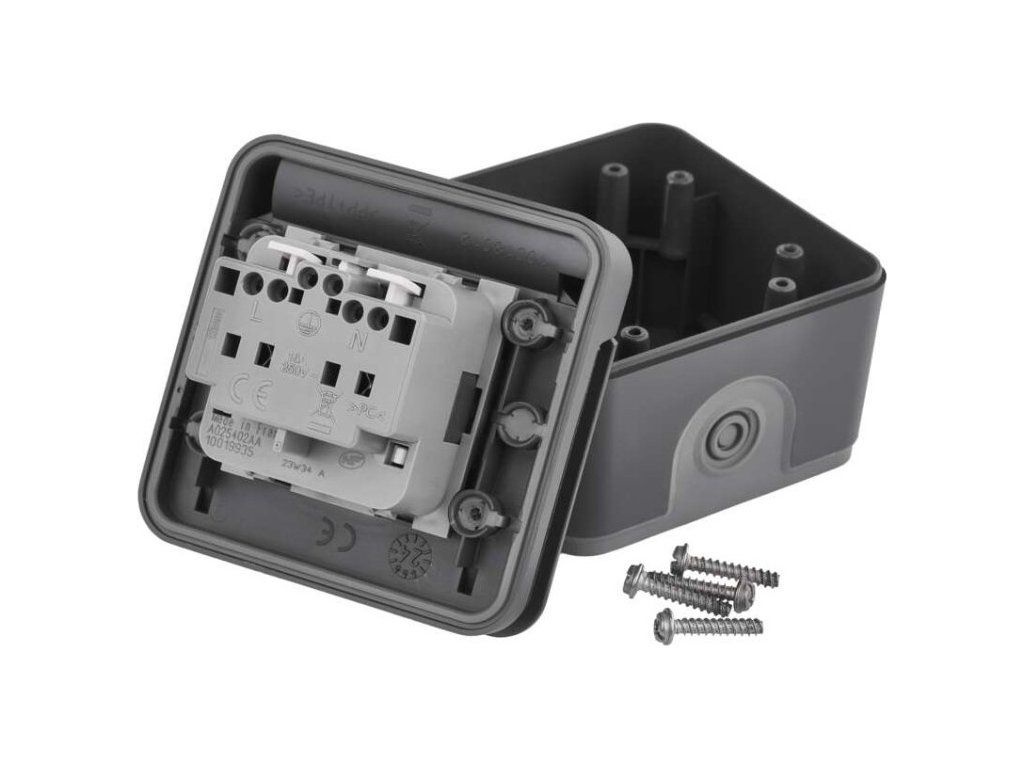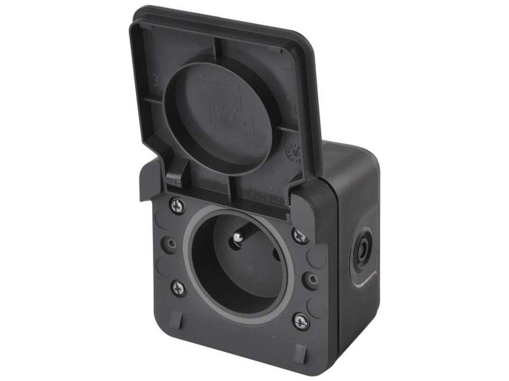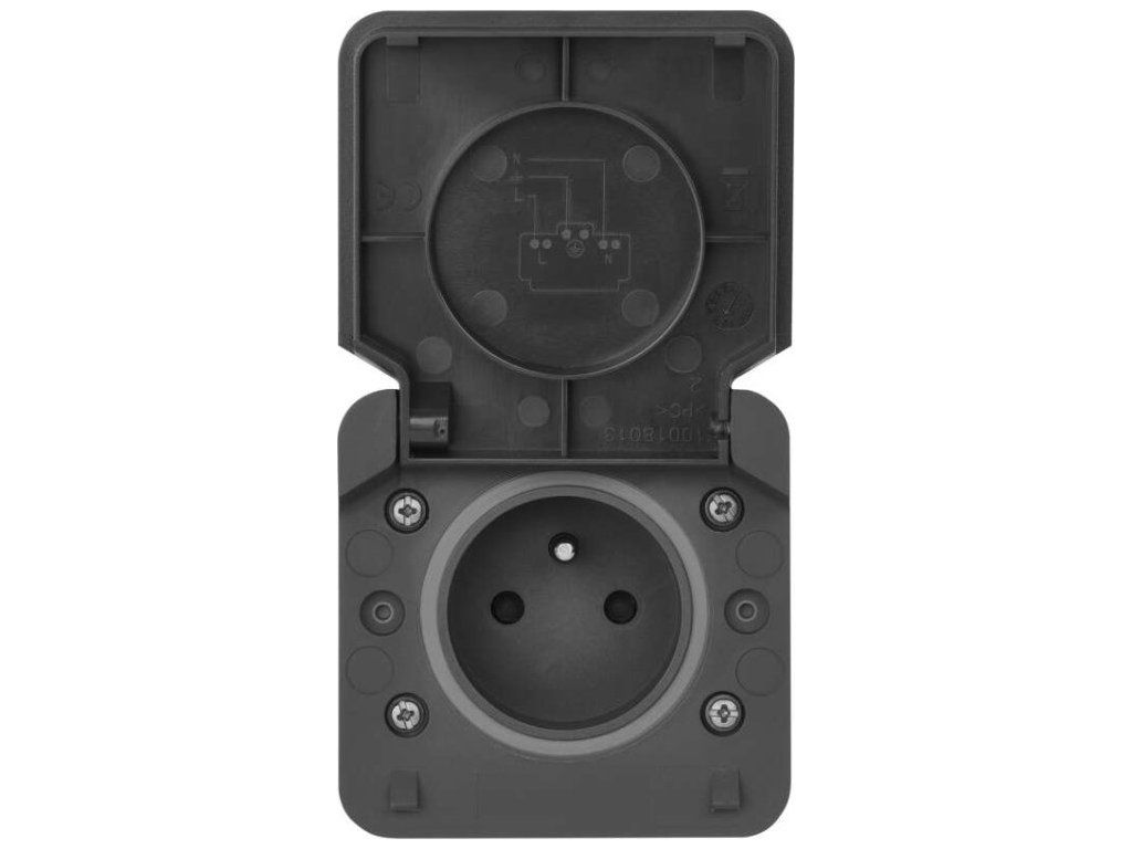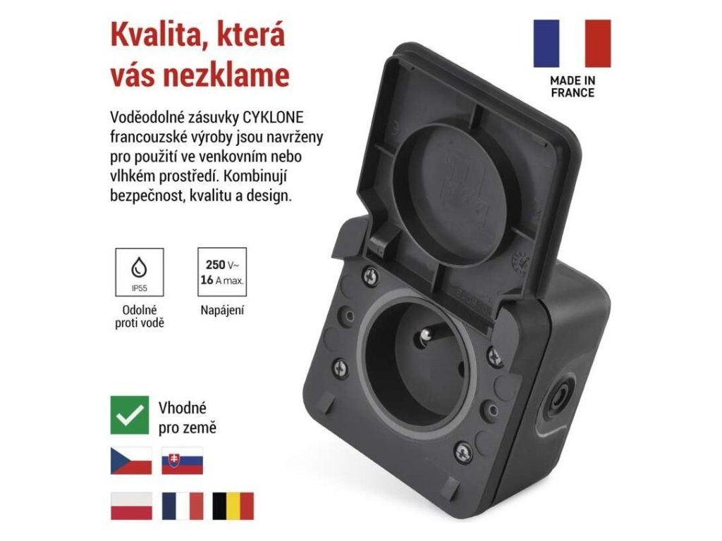 Kvalitní nástěnná voděodolná FRENCH zásuvka s ochraným víčkem vyrobena ve Francii.