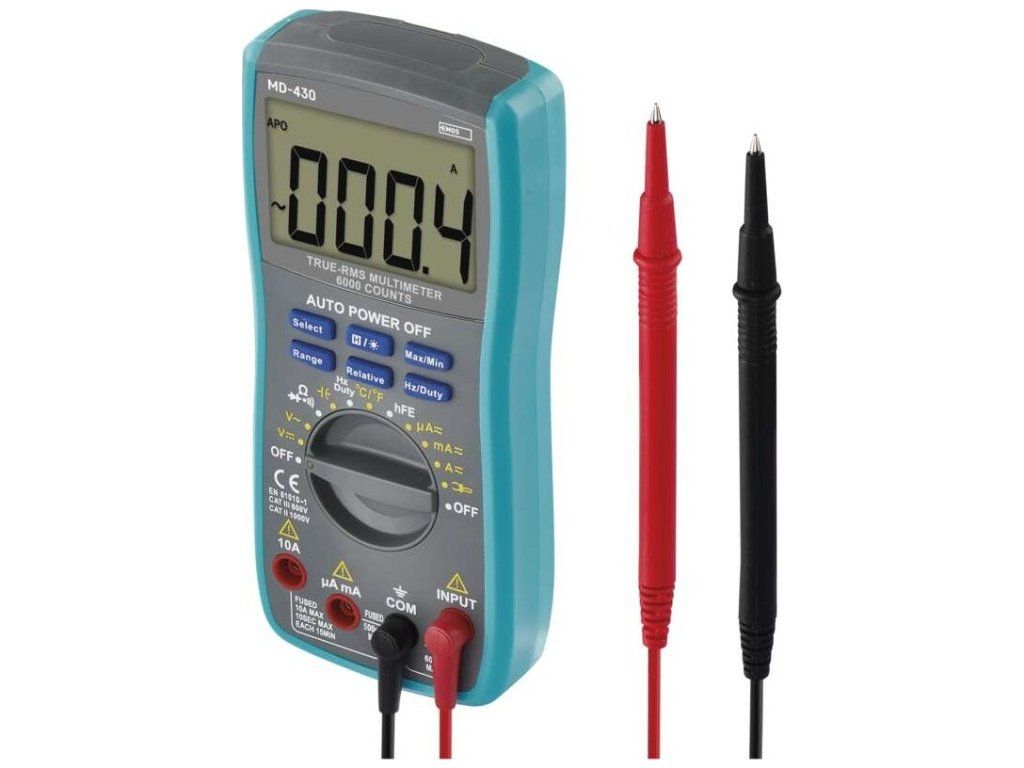 | Součást dodávky: | baterie, měřicí hroty, redukce pro měření tranzistorů, tepl. sonda typu K |