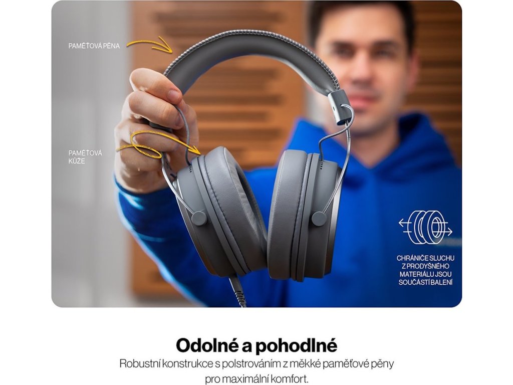 Ergonomický design a měkké polstrování zajišťují pohodlí i při hodinách hraní. Sada obsahuje náhradní pár náušníků z prodyšného materiálu, ideální pro teplejší dny nebo intenzivní používání.