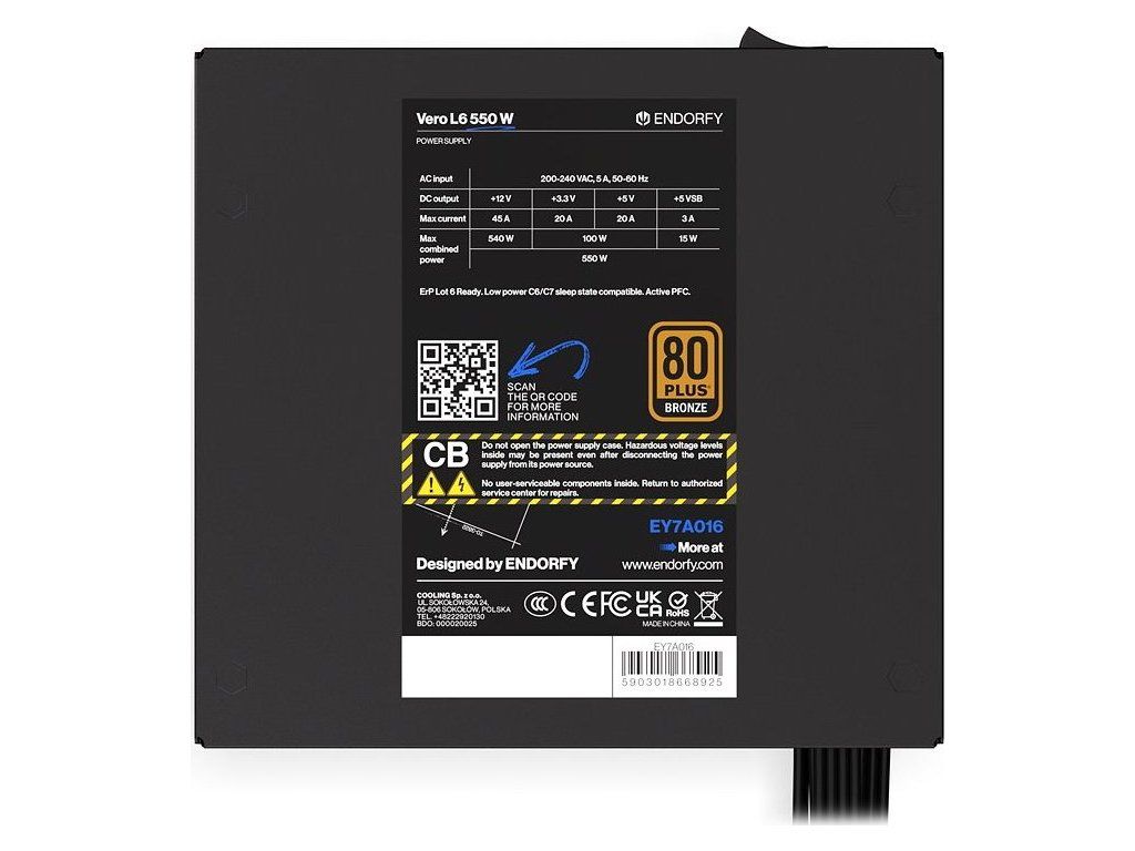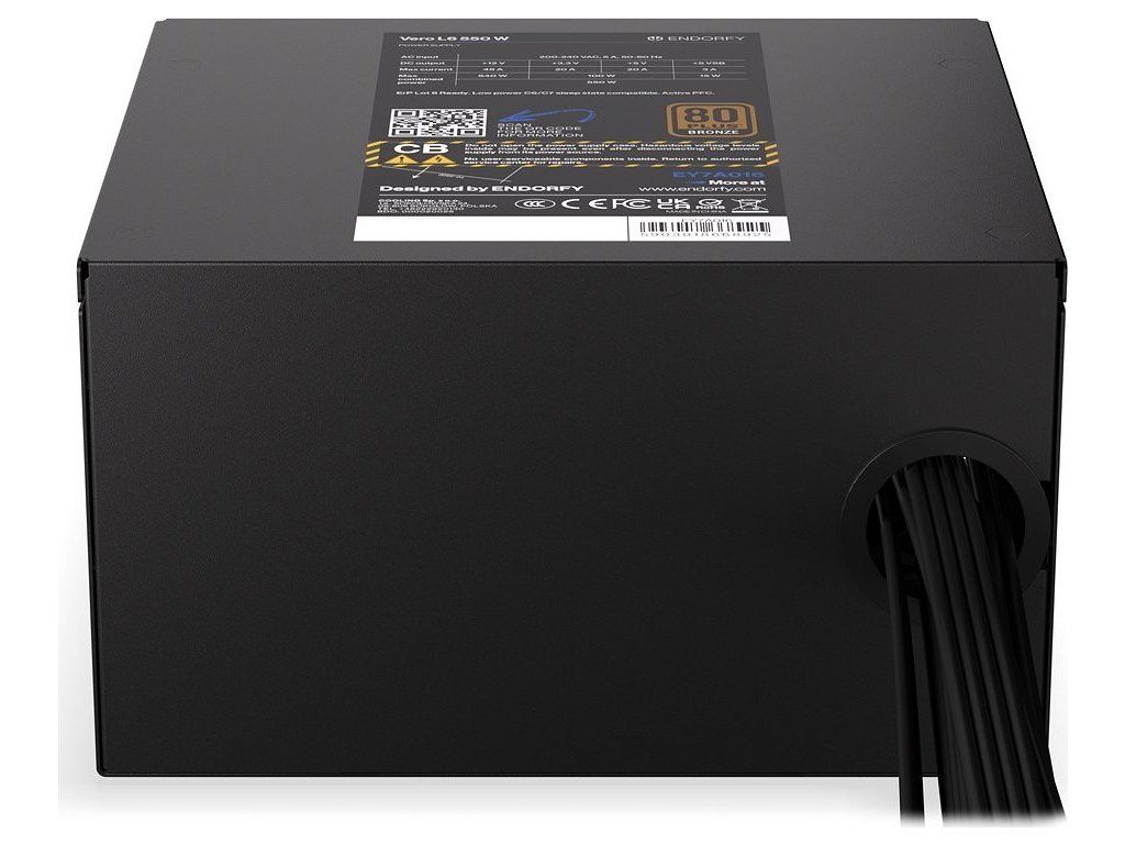 Napájecí zdroj Endorfy Vero L6 Bronze 550 W je navržen tak, aby spolehlivě a v tichosti utáhnul i výpočetně náročné PC sestavy. Díky certifikaci 80 PLUS Bronze a Cybenetics Silver dosahuje vysoké účinnosti, takže nebudete platit zbytečné účty za elektřinu. Současně podpoří stabilní napájení, ať už se jedná o herní, nebo pracovní počítač.