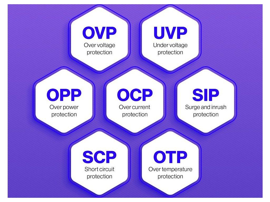 - Kompletní sada ochranných prvků OVP, UVP, OCP, SCP, OPP, SIP a OTP