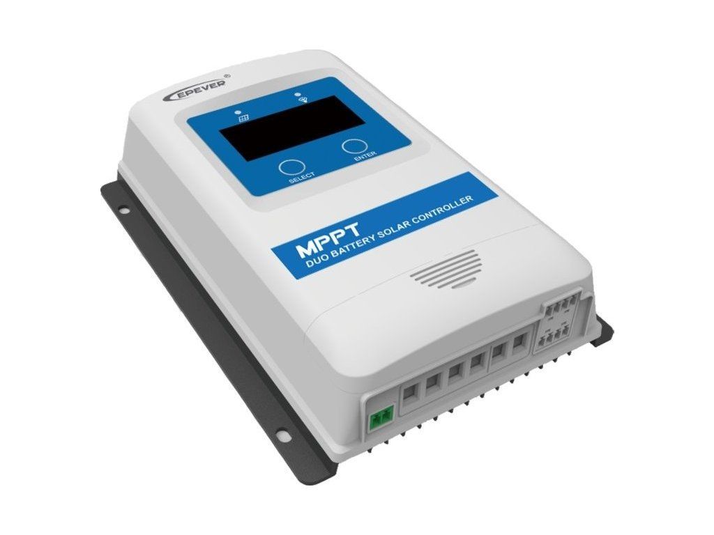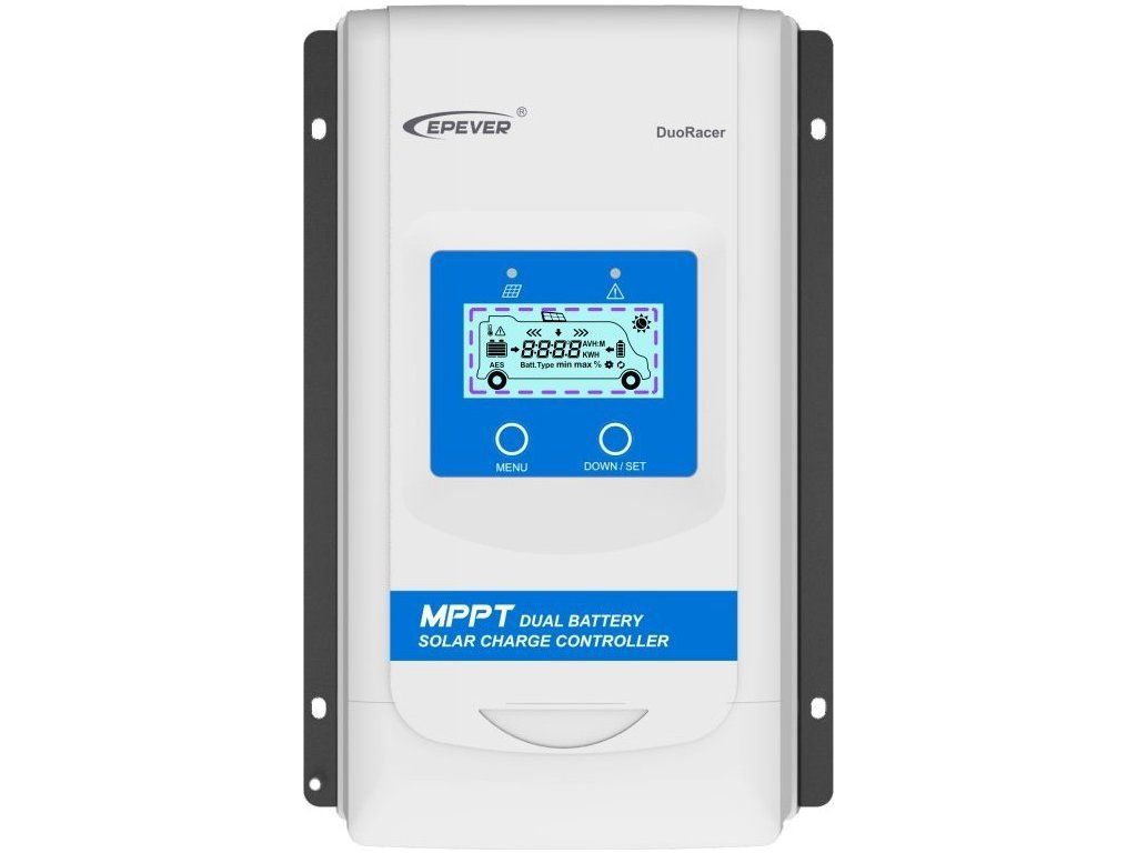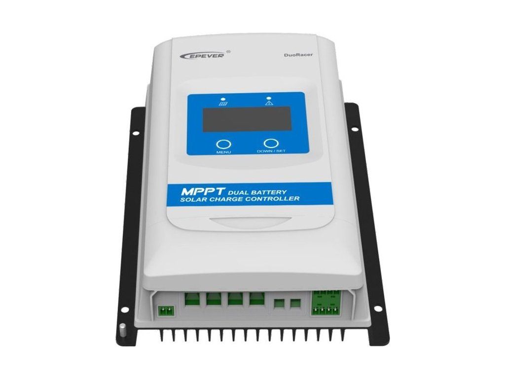 EPEVER DR3210-DDSMPPT regulátor série DuoRacer je určen k nabíjení dvou baterií vhodný pro karavany, lodě atd. Napětí panelů až 100 V a maximálním nabíjecím proudem 30 A, baterie 12/24 V, FV max. 390/780 Wp.