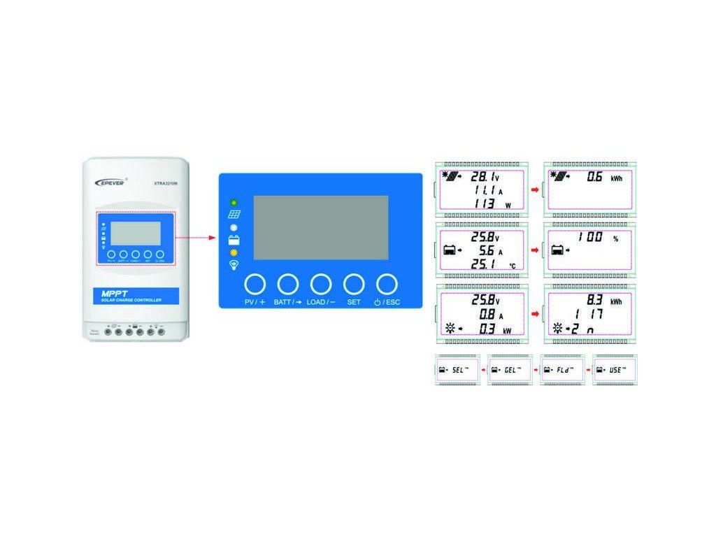 Přímo v MPPT regulátoru je integrován multifunkční displej pro snadný monitoring systému a případné nastavení provozních parametrů vč. kontrolních LED diod. Přes displej lze tedy nastavit vše mimo uživatelských hodnot baterie. Tyto hodnoty se nastavují přes příslušenství viz níže.