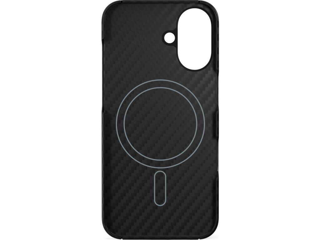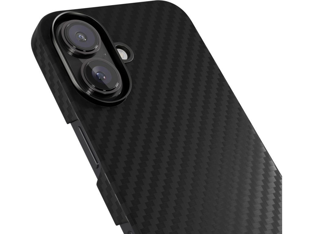 Kryt na telefon, pro Apple iPhone 16 Plus, kompatibilní s MagSafe, materiál aramidové vlákno, hliníkový rámeček kolem objektivů, barva černá.