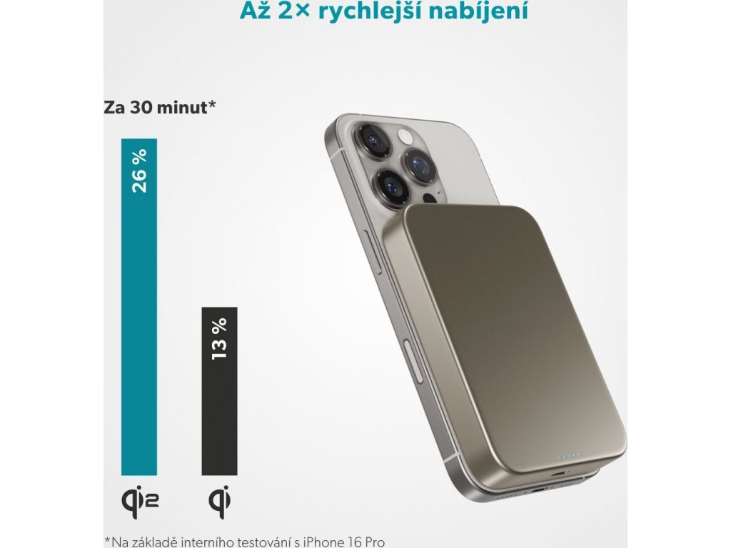 Díky technologii Qi2 si užijete bezdrátové nabíjení až 2× rychlejší než standardní Qi nabíjení, s maximálním výkonem 15 W. Silný magnet zajistí bezpečné přichycení k vašemu smartphonu, takže se nemusíte obávat nechtěného odpojení.