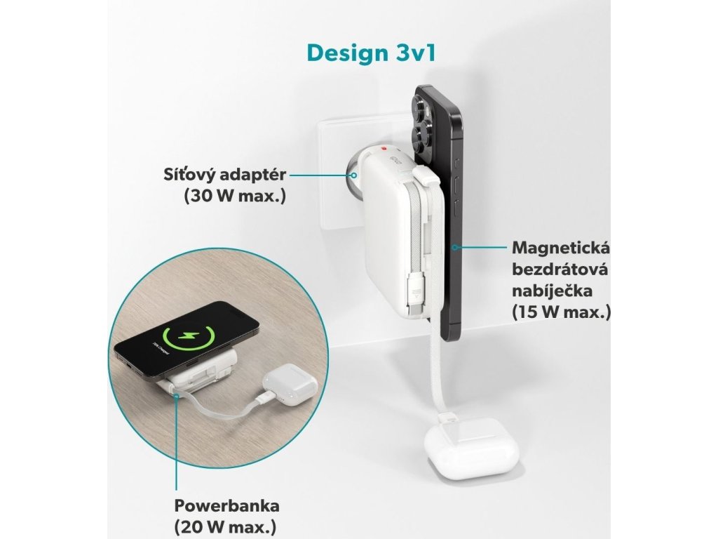 Vestavěná US zástrčka spolu s přiloženými adaptéry pro EU, UK a AU zajistí kompatibilitu prakticky kdekoliv na světě bez nutnosti přenášet více různých nabíječek. Při zapojení do sítě poskytuje výkon až 30 W přes USB-C a v režimu powerbanky umožňuje kabelové nabíjení výkonem až 20 W. Součástí balení jsou dva opletené USB-C kabely – vestavěný a odnímatelný oba podporující rychlé nabíjení až 60 W. Přehledný LED indikátor navíc zobrazuje aktuální kapacitu baterie.