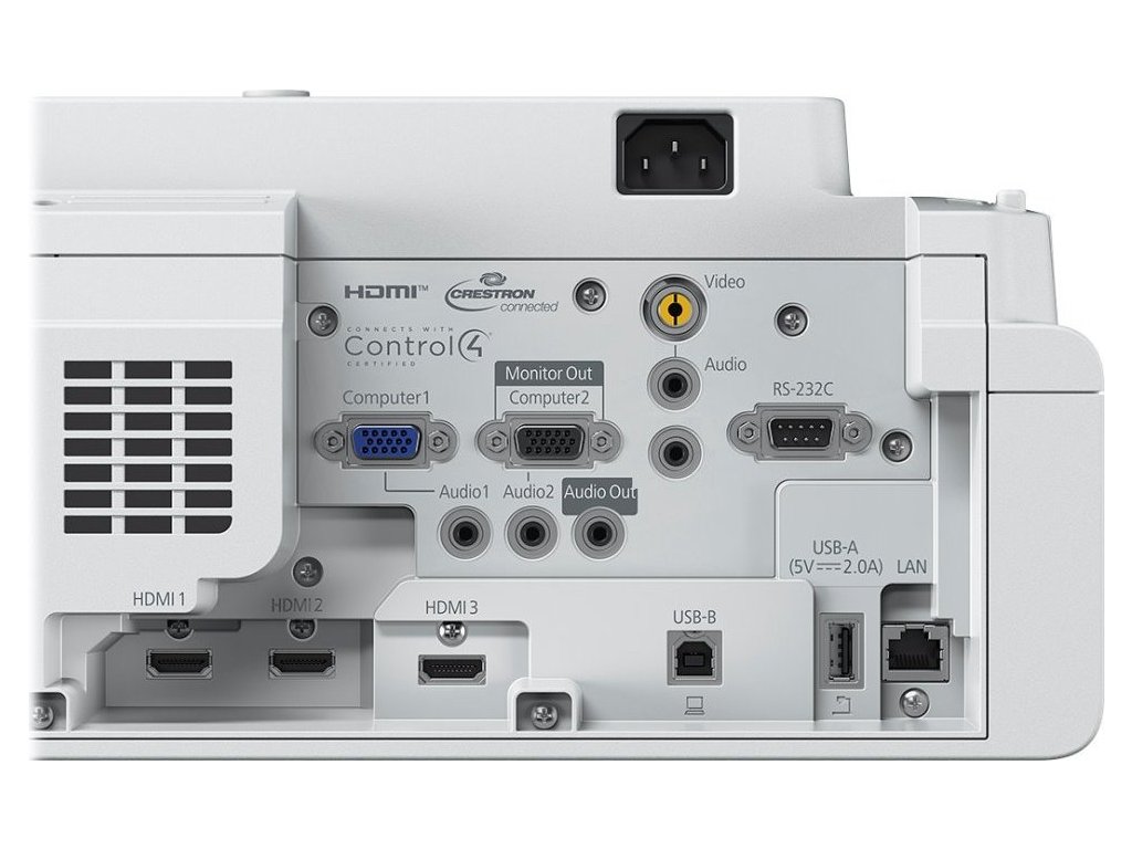 Rozhraní: USB 2.0-A (2x), RS-232C, Ethernetové rozhraní (100 Base-TX / 10 Base-T), bezdrátová síť LAN IEEE 802.11a/b/g/n/ac (WiFi 5), VGA vstup (2x), VGA výstup, HDMI vstup (3x), kompozitní vstup, Miracast, audiovýstup, stereofonní konektor mini-jack, audiovstup (3x), USB 2.0 typ B (pouze servis), Wi-Fi Direct, vstup pro mikrofon