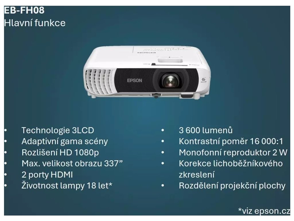 Díky jasu 3600 lumenů zůstává obraz živý a dobře čitelný i během denních hodin. Projektor Epson EB-FH08 je baven technologií 3LCD, která výrazně zvyšuje kvalitu barev v porovnání s běžnými DLP modely. Samozřejmostí je také ozvučení, které zajišťuje zabudovaný reproduktor s výkonem 2 W. Ten je dostatečně silný pro běžné použití, ale v případě potřeby můžete využít dostupnou konektivitu a připojit externí audio.