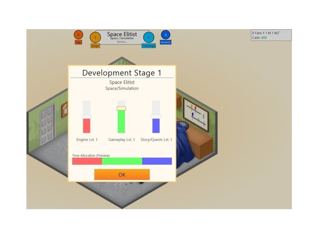 Na začátku hry si založíte svoji postavua společnost. Příliš peněz na účtu zatím nemáte, takže vám nezbývá nic jiného,než se pustit do vývoje vlastní hry. Během vývoje hry si volíte parametry, podlekterých se hra může (ale také nemusí) stát úspěšná - herní platforma, druh grafiky, zvuku, váš vlastní engine pro lepšítechnologie a poměry například level designu, AI, vizualizace..., které určují,na co se má váš herní vývojář více zaměřit (také za to dostává zkušenostní body). To vše vás ale stojí nemalé peníze, proto musíte každý krok dobře promýšlet.