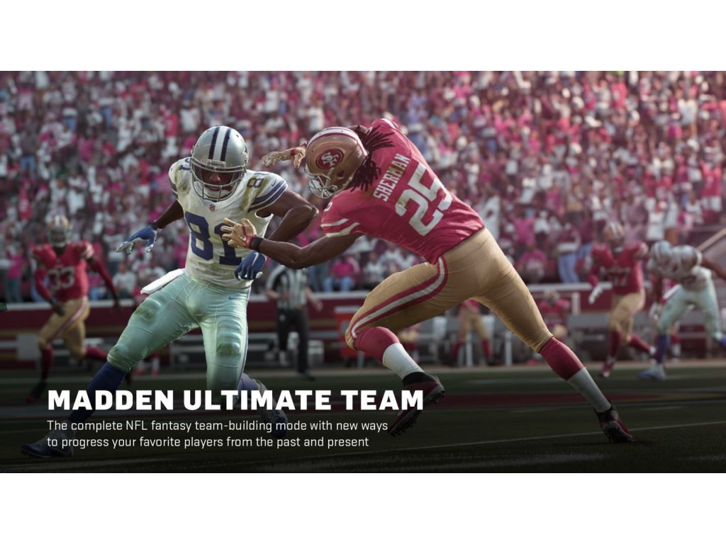 Poziční archetypy: Váš plán určí, jakéarchetypy jsou nejlepší na jakou pozici. Každý poziční archetyp má své silné aslabé stránky, podle toho musíte udělatrozhodnutí kolem kterého důležitého hráče postavíte vaší taktiku. Vybírejte až ze 4 archetypů na každou pozici v útoku aobraně k nejlepšímu zapadnutí do vaší taktiky. Systém dovednostních bodů: Novýsystém dovednostních bodů vám poskytne hladší a vyváženější metody pro rozvoj hráče. Získávej XP na hřišti k získání dovednostních bodů pro vylepšení vašeho hráče na o jeden overall bod. Každé vylepšení dovednostním bodem permanentně zvýšíhodnocení vybraného archetypu hráče. Běžný draft pro vytvoření třídy: Vytvářej,sdílej a vkládej běžný draft tříd inspirovaný vašemi oblíbenými hráči z minulosti a současnosti. Madden Ultimate Team:Vaši hráči, vaše strategie, vaše sláva.Madden Ultimate Team vám přináší kompletní NFL fantasy mód budování mužstva s novými možnostmi jak získat vaše oblíbenéhráče z minulosti i současnosti a užívání si zábavy, živých solo a koop výzev vclorořním soutěžení. Získávej odměny vevšech nových možnostech jak hrát a vylepšovat svůj tým s hostováním legendárníchNFL hráčů.