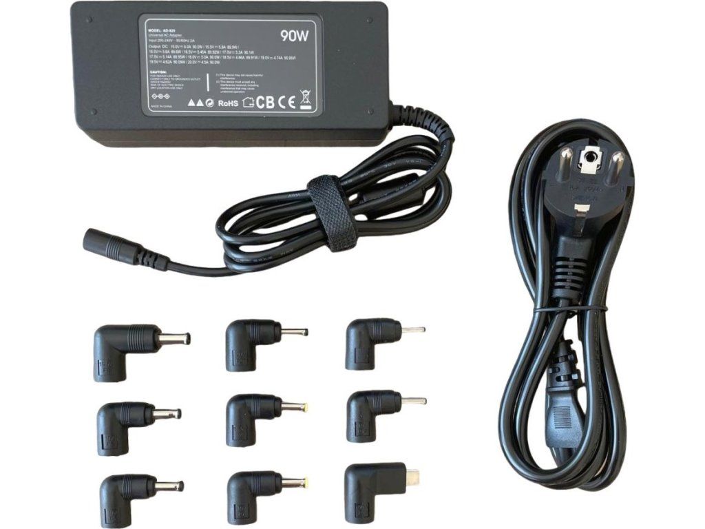 Univerzální 90 W napájecí adaptér s automatickou identifikací napětí a devíti různými koncovkami pro širokou kompatibilitu s notebooky.
