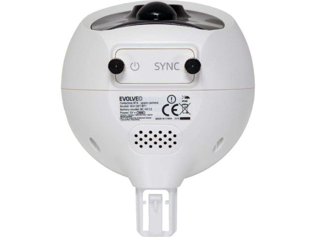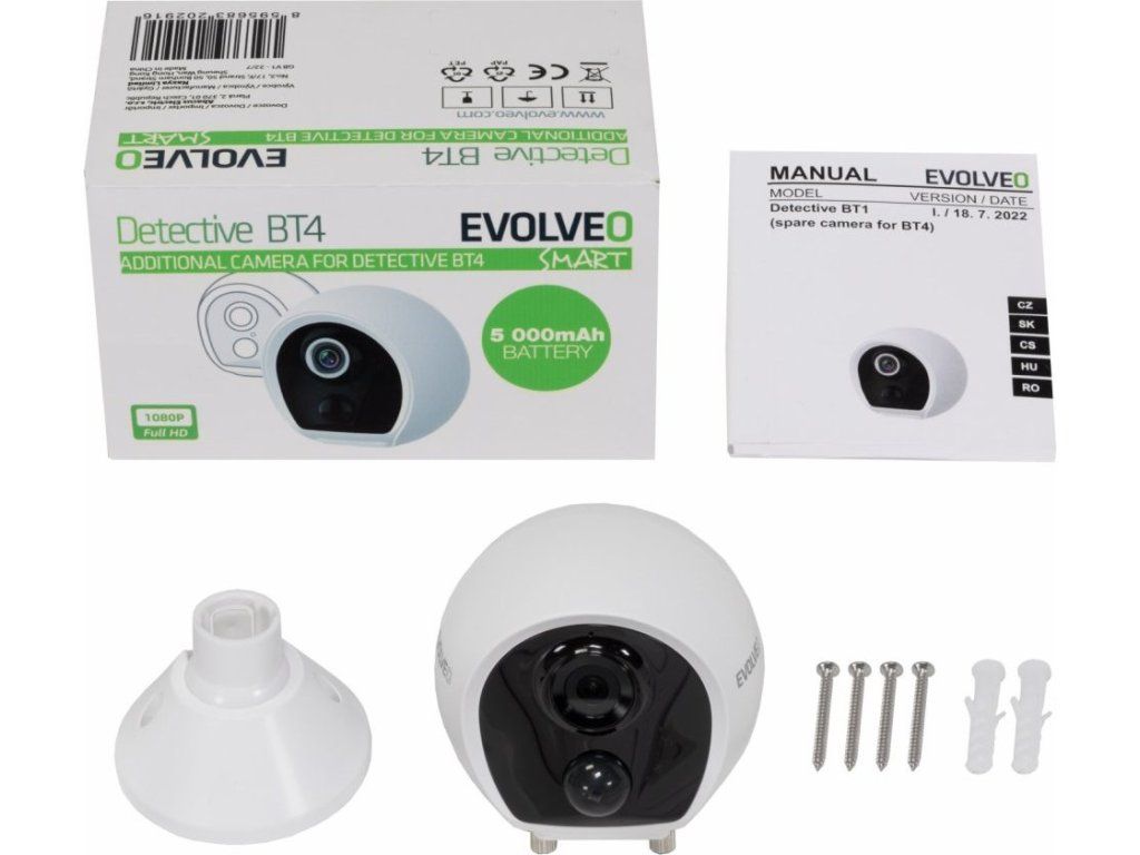 Náhradní kamera určená pro rozšíření instalace EVOLVEO Detective BT4. Kamera je vybavená akumulátorem s 5000mAh kapacitou. Pod krytkou se nachází USB-C konektor pro nabíjení a tlačítko pro zapnutí/vypnutí a párovací režim. Kamera je vybavená nočním IR přísvitem a PIR čidlem pro rozeznání pohybu. Součástí kamery je i mikrofon a reproduktor pro obousměrnou hlasovou komunikaci.