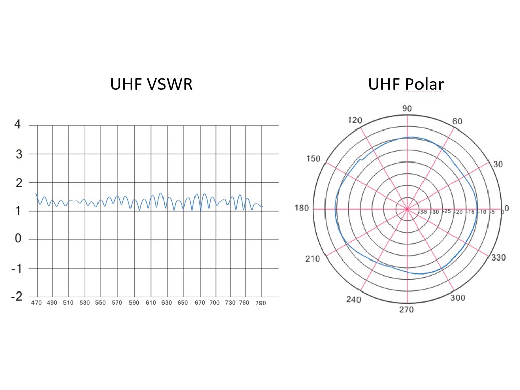 UHF VSWR graf zobrazuje účinnost antény v pásmu UHF. Koeficient rovný 1 znamená přeměnu všech elektromagnetických vln na elektrický signál. S grafem UHF Polar je možné pozorovat oblasti prostoru antény s nejlepším ziskem. Anténa Jade 3 je všesměrová, znamená to tedy možný příjem ve všech směrech.