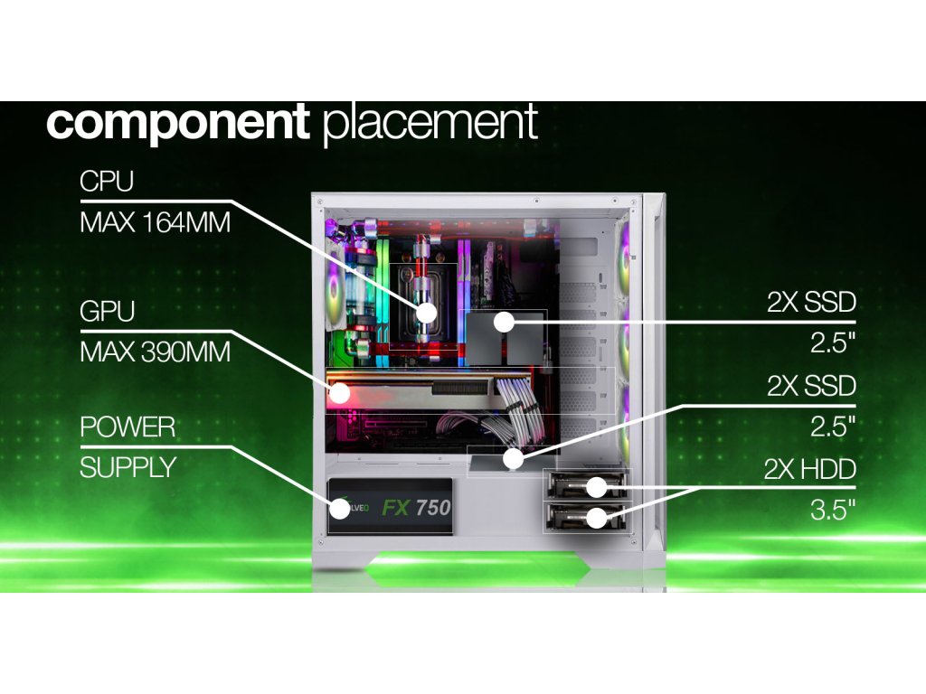 Vnitřní prostor této herní počítačové skříně je navržen tak velkoryse, že může být základem i pro ty nejambicióznější počítačové sestavy. Chladič procesoru může měřit až 164 mm na výšku. Grafická karta se sem vejde v délce až 390 mm. A pro ukládání dat je k dispozici místo pro 2 klasické pevné disky (3,5") a 3 moderní rychlá SSD úložiště (2,5"). Každá hardwarová součástka je zkrátka v této digitální pevnosti vítaným hostem a dostane se jí péče jako na císařském dvoře. Roli přitom nehraje ani její urozený původ – do skříně se dají vložit základní desky Intel i AMD, přičemž jsou podporovány formáty ATX, eATX (Extended ATX), mATX (Micro ATX) i mITX (mini ITX).