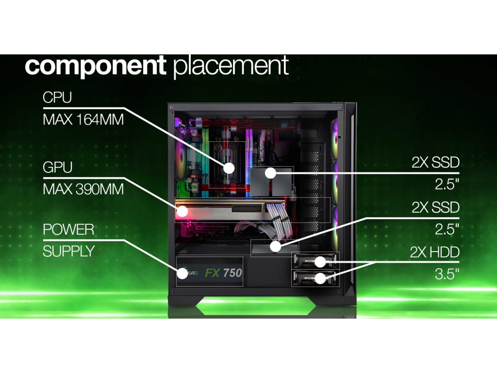 Vnitřní prostor této herní počítačové skříně je navržen tak velkoryse, že může být základem i pro ty nejambicióznější počítačové sestavy. Chladič procesoru může měřit až 164 mm na výšku. Grafická karta se sem vejde v délce až 390 mm. A pro ukládání dat je k dispozici místo pro 2 klasické pevné disky (3,5") a 3 moderní rychlá SSD úložiště (2,5"). Každá hardwarová součástka je zkrátka v této digitální pevnosti vítaným hostem a dostane se jí péče jako na císařském dvoře. Roli přitom nehraje ani její urozený původ – do skříně se dají vložit základní desky Intel i AMD, přičemž jsou podporovány formáty ATX, eATX (Extended ATX), mATX (Micro ATX) i mITX (mini ITX).