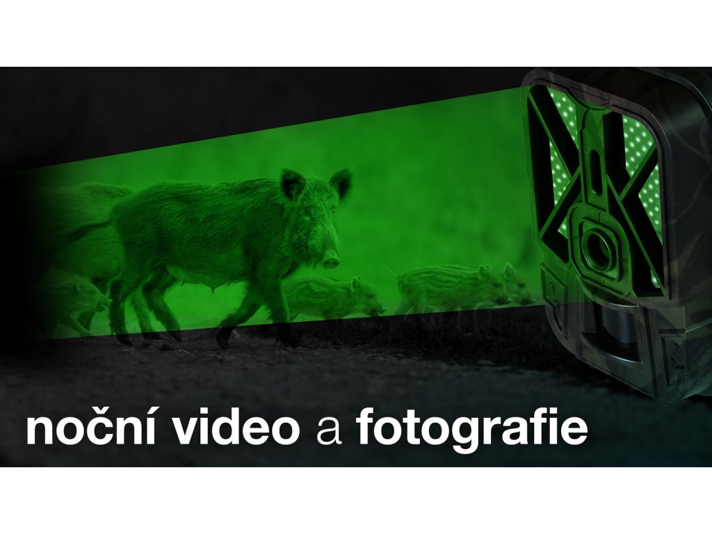 Video lze zaznamenávat v nejvyšší kvalitě Full HD, noční záznam nebo fotografování umožní 58 infračervených přisvětlovacích diod s vlnovou délkou 940nm, která je pro lidské i zvířecí oko neviditelná a nevyplaší Vám tak zvěř před objektivem. Ke snímání pohybu dochází v širokém zorném poli 120° pomocí PIR čidla s nastavitelnou citlivostí snímání, které zaručí automatické spuštění záznamu vždy, když zvěř projde před nastavenou kamerou.