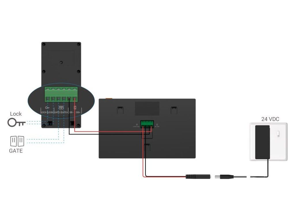 Rozhraní: 1× 2drát pro monitor, 1× nenapájený kontakt pro vrata, 1× kontakt pro zámek