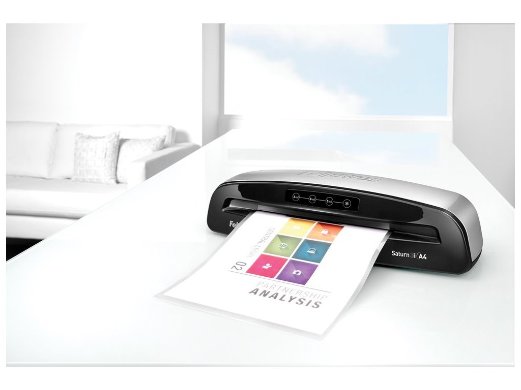 Fellowes Saturn 3i A4Laminátor pro domácnost či malou kancelář. Umožňuje laminování za tepla i za studena ve formátu A4 bez nutnosti použití ochranné obálky. Díky systému Jam Free se výrazně zmenšuje riziko uvíznutí laminovaného dokumentu uvnitř stroje. Zařízení je vybaveno LED diodou signalizující možné zablokování laminovaného dokumentu, systémem pro uvolnění válců a případné zpětné vysunutí laminovaného dokumentu, uvolňovací páčkou na zadní části stroje a světelnou a zvukovou signalizací připravenosti k práci. Energeticky úsporná funkce Auto Shut Off zajišťuje automatické vypnutí zařízení po 30 minutách nečinnosti, díky čemu snižuje spotřebu elektrické energie a zamezuje přehřátí.