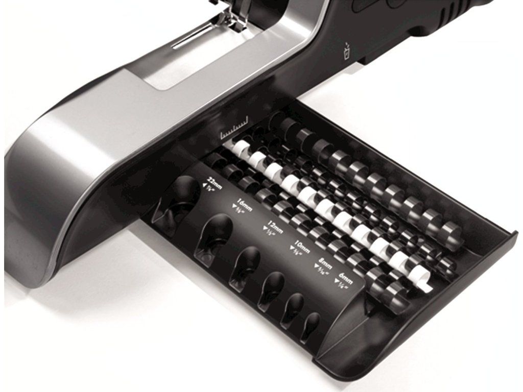 Stroj je vybaven větším zásobníkem na uložení několika plastových hřbetů a integrovanou měrkou pro správnou volbu průměru hřbetu. Na čelní straně stroje je průzor pro snadnou kontrolu zaplnění odpadního prostoru.