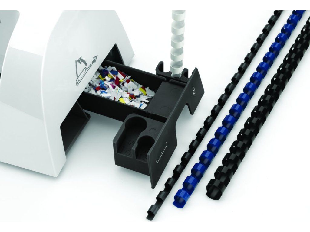 Oddělená děrovací a vázací páka pro průběžné vkládaní děrovaných listů do plastového hřbetu výrazně zefektivňuje práci. Díky delší děrovací páce je třeba k děrování minimum síly. Stroj je vybaven integrovanou měrkou pro správnou volbu průměru hřbetu.