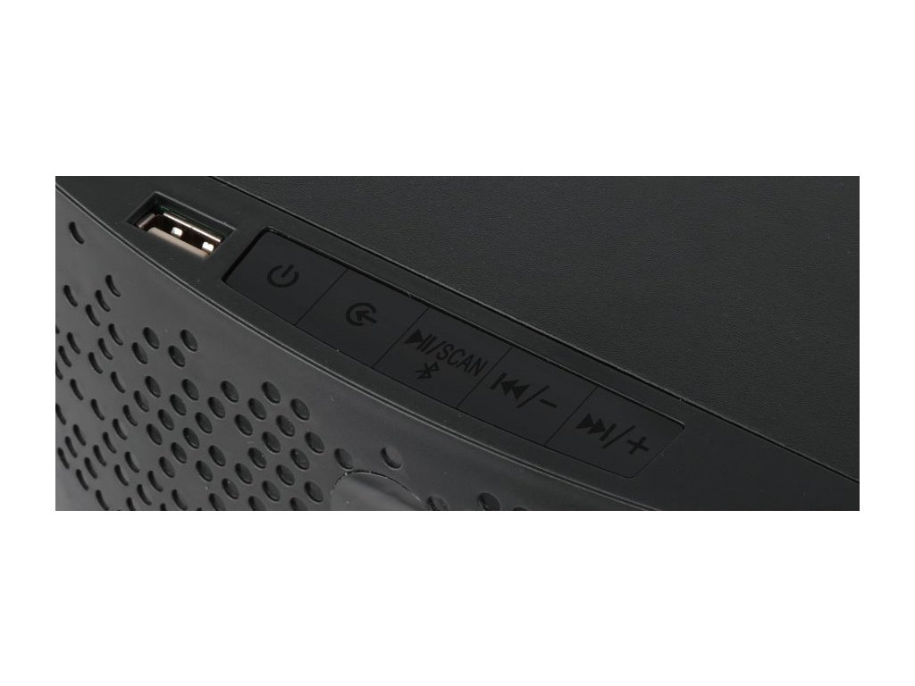 Na vrchní straně je umístěn ovládací panel i USB vstup pro připojení USB zařízení, nechybí ani praktické 3.5mm rozhraní pro připojení sluchátek, abyste poslechem své oblíbené hudby nerušili ostatní, či funkce rádia.