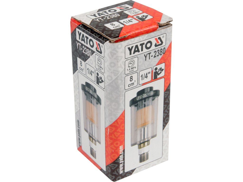 Mini filtr Yato YT2380 je určen k odstranění prachových částic, kondenzované vody, případně oleje vznikající stlačením vzduchu v kompresoru. Tento malý filtr je předurčen k montáži přímo ke vstupu vzduchu do nářadí, nebo vsazením do přívodu hadice.