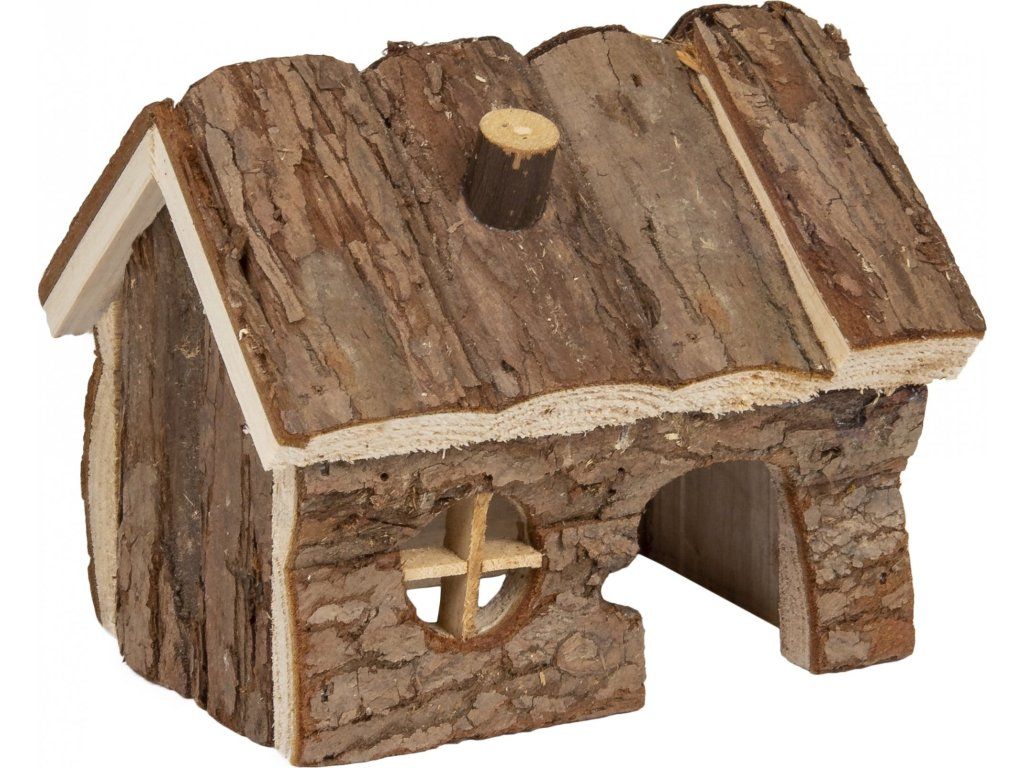 Hezký dřevěný domeček je vyrobený pouze z přírodních materiálů. Ideální na hraní i jako úkryt. Může dobře posloužit i k broušení zubů.