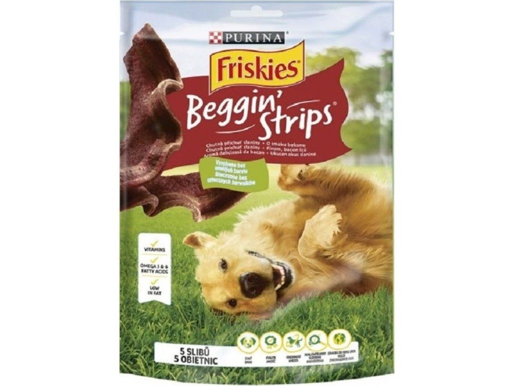 Složení: obiloviny, bílkovinné extrakty rostlinného původu, maso a výrobky živočišného původu, cukry, oleje a tuky, minerální látky, mléko a mléčné výrobky. S barvivy, antioxidanty a konzervováno s: doplňkové látky ES.Deklarované jakostní znaky: dusíkaté látky 15%, oleje a tuky 6%, popel 4%, vláknina 1%, vlhkost 24%, Omega-3 mastné kyseliny:800mg/kg, Omega-9 mastné kyseliny: 10 000mg/kg.Beggin´ Strips je doplňkové krmivo pro psy, které může být podáváno kdykoli během dne jako pochoutka nebo odměna. Čerstvá voda by měla být vždy k dispozici.