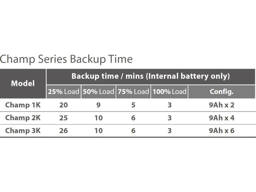 Řada Champ Tower je verze záložních zdrojů s vysokou hustotou dvoukonverzních online UPS s výkonovým faktorem 0.9. Je navržen v malém rozměru s mikroprocesorovým řadičem. Jeho vhodné umístění je ve firmách jako záložní zdroj pro napájení serverů, s jeho maximální hlučností 50dB na 1 metr. Champ mají také standardní porty USB a RS-232 s vestavěným inteligentním slotem pro další adaptéry, převodníky protokolů a kartičky kontaktů.