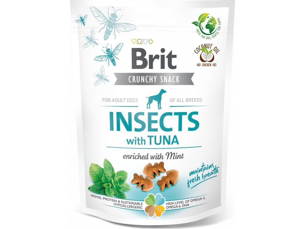 Funkční křupavé pamlsky s hmyzem a tuňákem, pro osvěžení dechu obohaceny o mátu. Základem receptury chutných pamlsků je hmyzí protein, který se dobře tráví a snižuje riziko alergie.